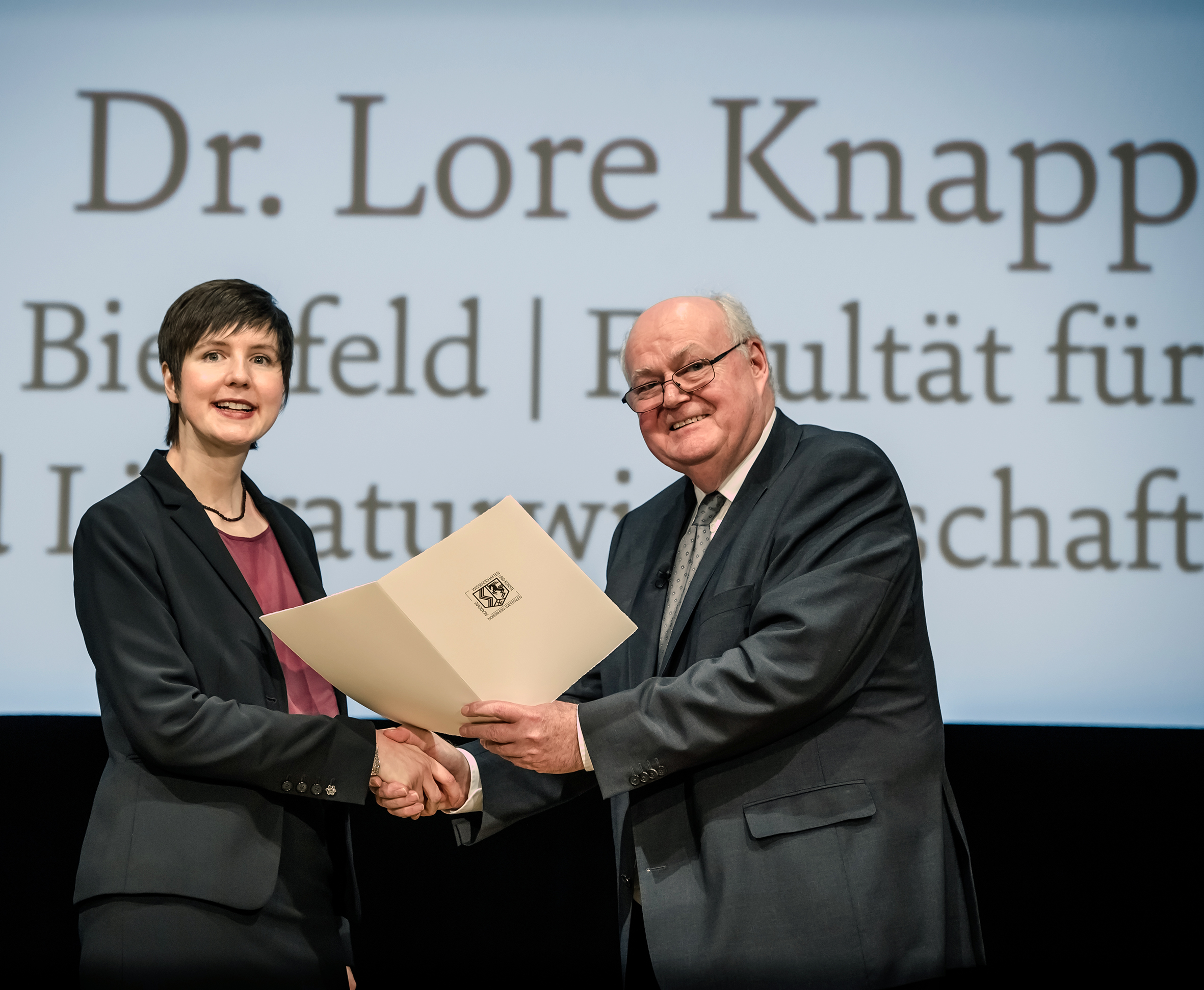 Dr. Lore Knapp (Jahrgang 1983) ist gestern (17.01.2017) von der Nordrhein-Westfälischen Akademie der Wissenschaften und der Künste in das Junge Kolleg aufgenommen worden. Sie ist seit 2014 Akademische Rätin (vergleichbar einer Juniorprofessur) an der Fakultät für Linguistik und Literaturwissenschaft der Universität Bielefeld und habilitiert über den britisch-deutschen Literaturtransfer im 18. Jahrhundert. Sie hat Neuere deutsche Literatur, Theaterwissenschaft und Musikwissenschaft an der Freien Universität Berlin studiert, forschte an der Universität Cambridge, Großbritannien, und promovierte 2013 an der Freien Universität Berlin. Das Junge Kolleg fördert hervorragende Nachwuchswissenschaftlerinnen und Nachwuchswissenschaftler - maximal 30 – für jeweils vier Jahre und bietet ihnen interdisziplinären Austausch sowie ein jährliches Stipendium in Höhe von 10.000 Euro. Voraussetzung für die Mitgliedschaft sind zusätzlich zur Promotion herausragende wissenschaftliche Leistungen an einer Hochschule oder Forschungseinrichtung in Nordrhein-Westfalen. Derzeit sind drei Bielefelder Mitglied im Jungen Kolleg.