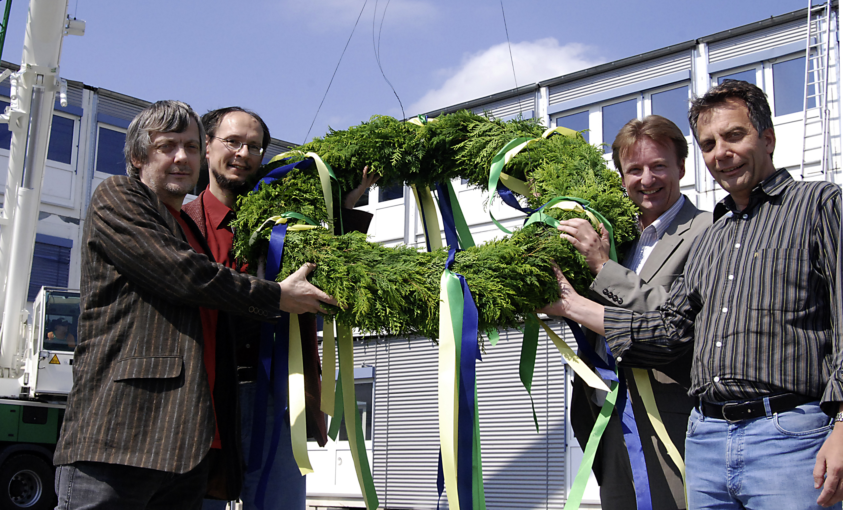 Richtfest Mobilgebäude (v. li.): Prorektor Prof. Dr. Rolf König, Prof. Dr. Helge Ritter (Sprecher Exzellenzcluster CITEC), Dr. Christian Schepers (Technischer Direktor), Prof. Dr. Gerhard Sagerer (stellv. Sprecher Exzellenzcluster CITEC). - Bild unten rechts: