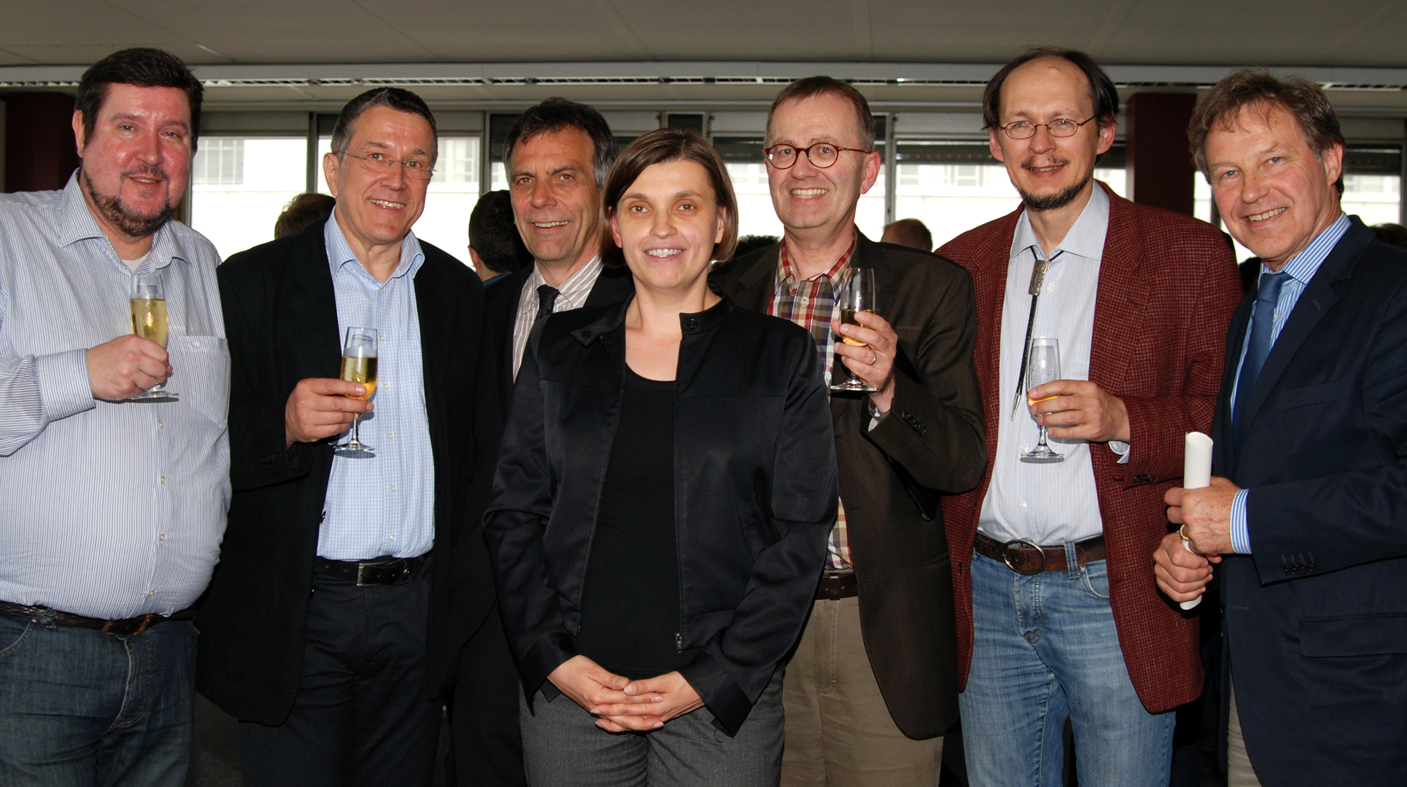 Haben doppelt Grund zum Feiern: Prof. Dr. Thomas Welskopp (BGHS), Prof. Dr. Alfons Bora (BGHS), Rektor Prof. Dr.-Ing. Gerhard Sagerer, Anita Adamczyk (CITEC), Prorektor Prof. Dr. Martin Egelhaaf, Prof. Dr. Helge Ritter (CITEC) und Kanzler Hans-Jürgen Simm.