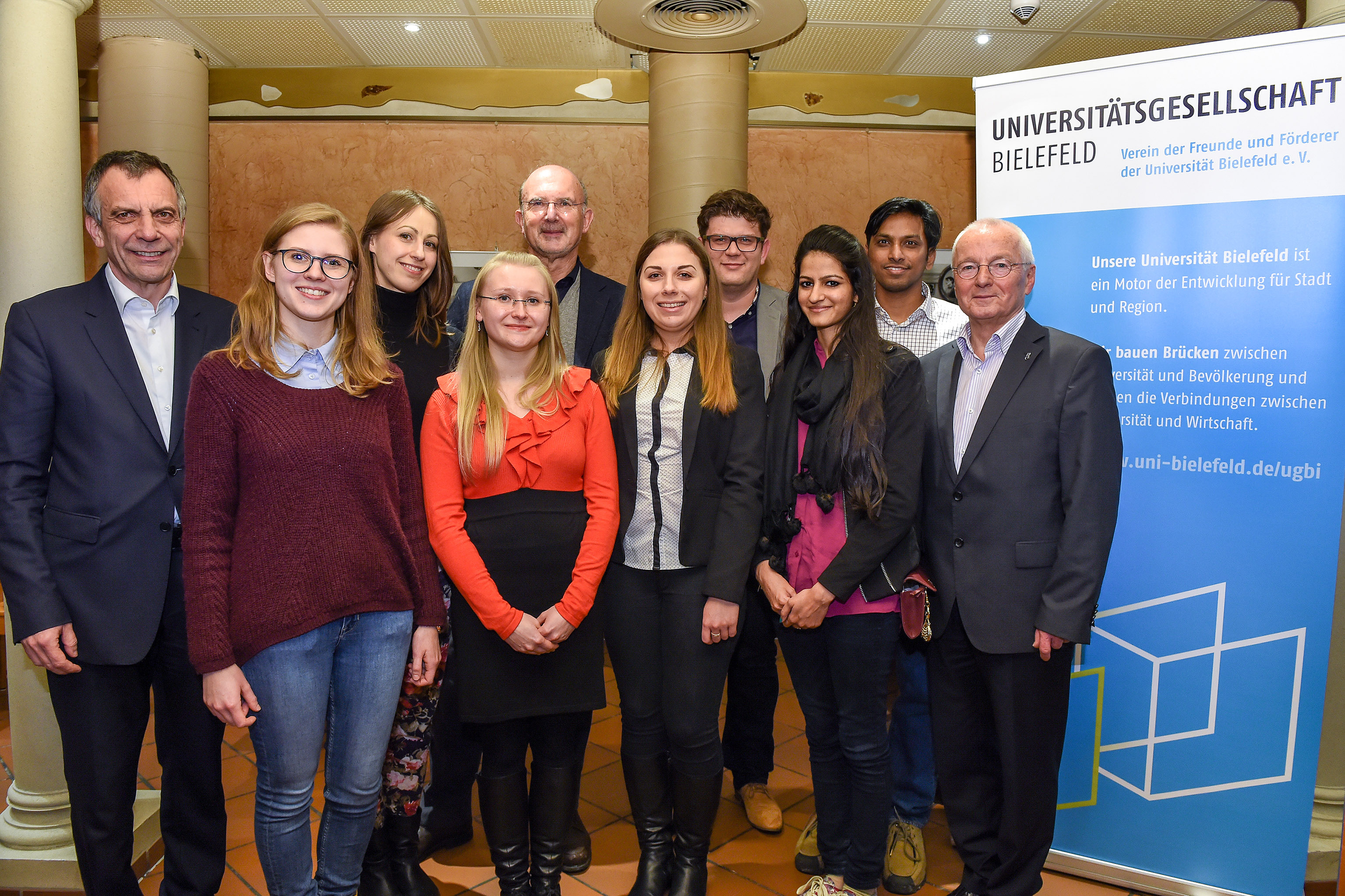 Auszeichnung der Stipendiaten: Rektor Prof. Dr.-Ing. Gerhard Sagerer, Aleksandra Cwiek, Bernadeta Zajac, Katarzyna Henze, Herbert Vogel, Paulina Gusowska , Macije Klezec, Hafsa Hassan, Vignesh Natarajan und Jürgen Heinrich (v.l.). Foto: Universitätsgesellschaft Bielefeld/Ch. Weische
