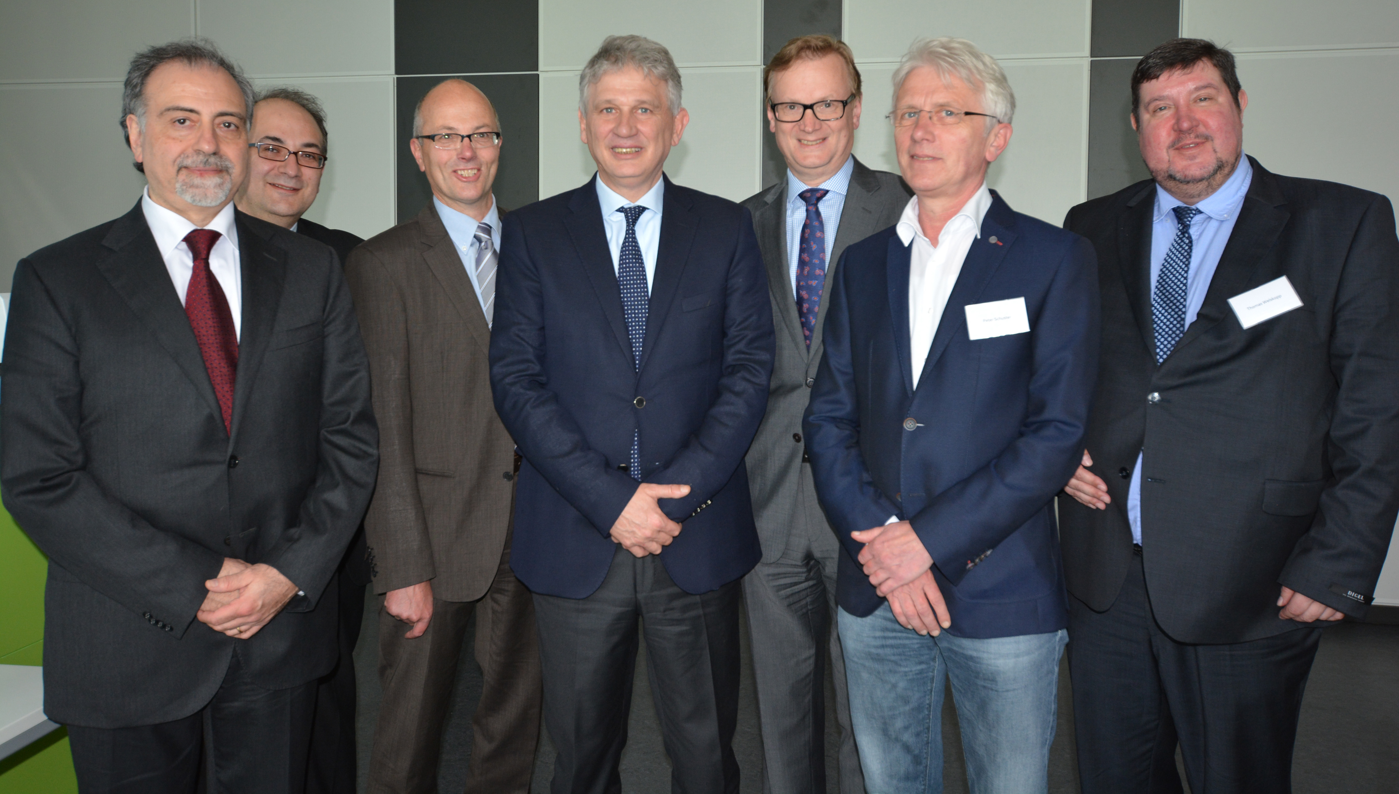 Eröffnen gemeinsam die Summer School: der italienische Konsul Alfredo Casciello, Dr. Vito Gironda und Dr. Stefan Gorißen von der Universität Bielefeld, der italienische Botschafter s. E. Pietro Benassi, Prof. Dr. Johannes Hellermann, Prof. Dr. Peter Schuster und Prof. Dr. Thomas Welskopp von der Universität Bielefeld (v.l.). Foto: Universität Bielefeld