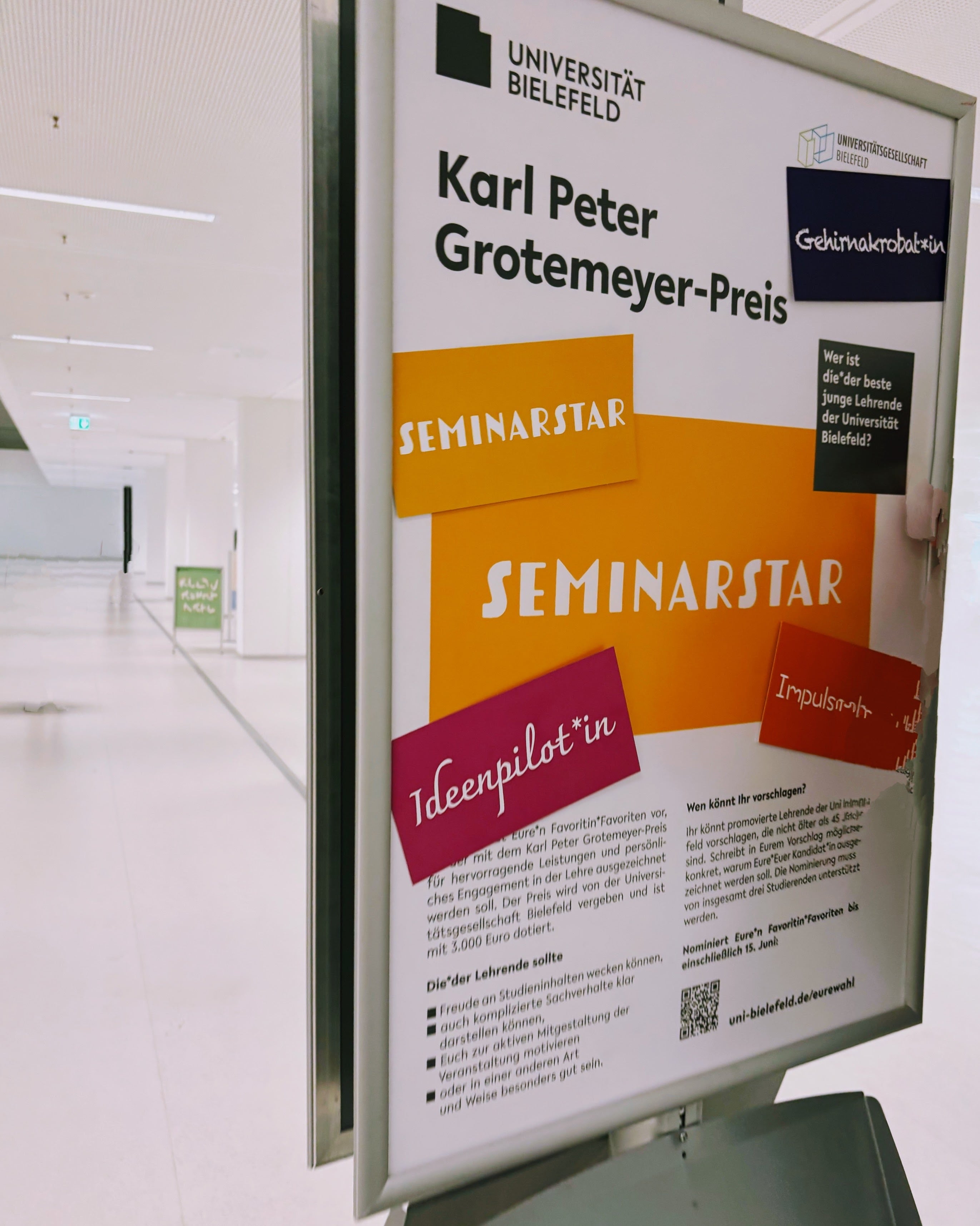 Jetzt beginnt für uns der schönste Teil des Wettbewerbs: Das Sichten all der wundervollen Nominierungstexte, in denen Studierende beschreiben, was die Lehre der Kandidat:innen so besonders macht. Wir freuen uns immer wieder zu lesen, welche tolle Sachen bei uns in der Lehre gemacht werden und welch engagierte Lehrende an der Uni Bielefeld zu Hause sind. Und auch für die Lehrenden selbst ist es manchmal eine angenehme Überraschung zu erfahren, dass die Mühe, die sie sich gemacht haben auch bei den Studierenden ankommt. Daher stellen wir den Lehrenden, wenn die Studierenden einverstanden sind, seit einigen Jahren ihre Nominationsschreiben zur Verfügung. Und auch wenn es für den Preis heißt „es kann jedes Jahr nur eine:n geben“, bekommen alle Nominierten, die die Preiskriterien erfüllen, eine Bescheinigung der Rektorin über ihre Nomination. So hoffen wir möglichst viel der Mühe und der Anerkennung, die die Studierenden in ihre Nominationen stecken, auch an die Nominierten weiterzugeben.
