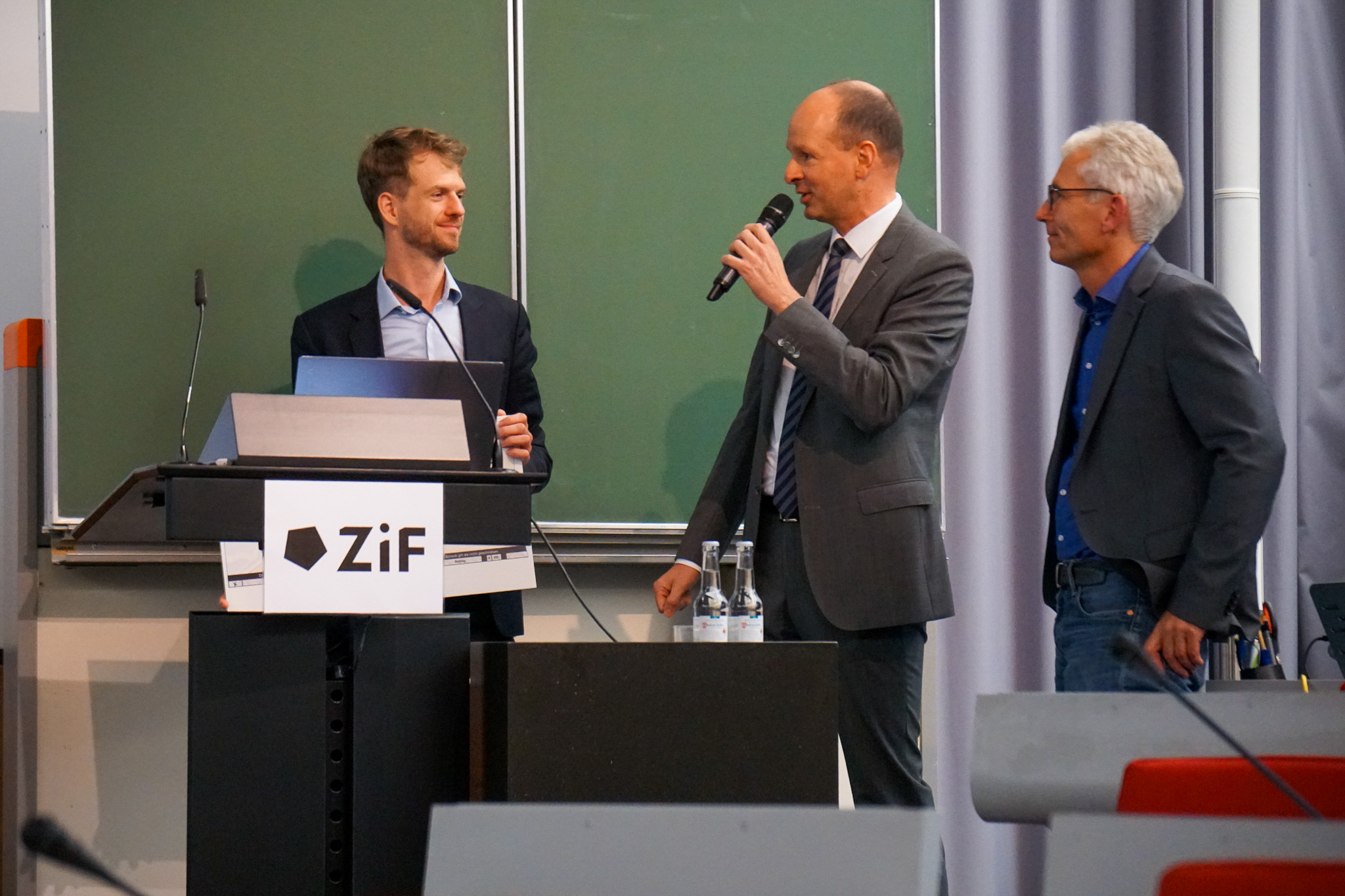 Am Ende des Wettbewerbs wurden die drei überzeugendsten Teams ausgezeichnet. Nach ihren Abschlusspräsentationen im Zentrum für interdisziplinäre Forschung (ZiF) erhielten sie Preisgelder in einer Gesamthöhe von 5.000 Euro. Die Auszeichnung wurde vom Institut für Anwalts- und Notarrecht der Universität Bielefeld gestiftet und von dessen geschäftsführendem Direktor, Professor Dr. Lutz Eidam, LL.M., überreicht.