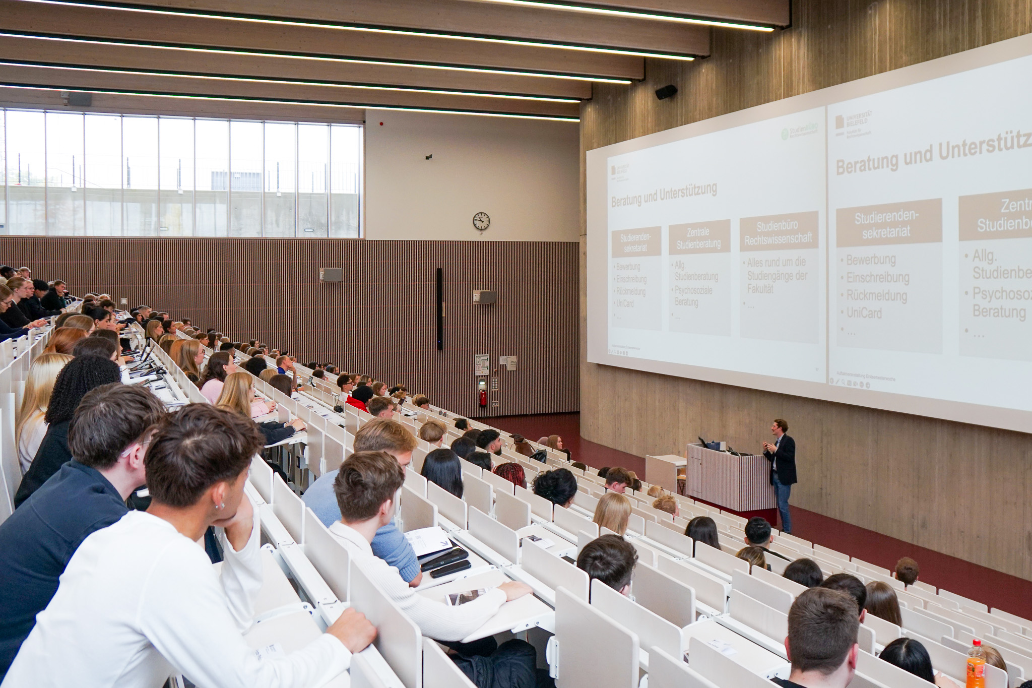 Diesen Dienstag fiel der Startschuss für die Erstsemesterwoche des Wintersemesters 2025/2026 an der Fakultät für Rechtswissenschaft der Universität Bielefeld. Im Hörsaal Y hieß Dekan Professor Dr. Michael Lindemann die neuen Jura-Studierenden herzlich willkommen – unterstützt von der Fachschaft Jura, dem Studienbüro und der Zentralen Studienberatung.
