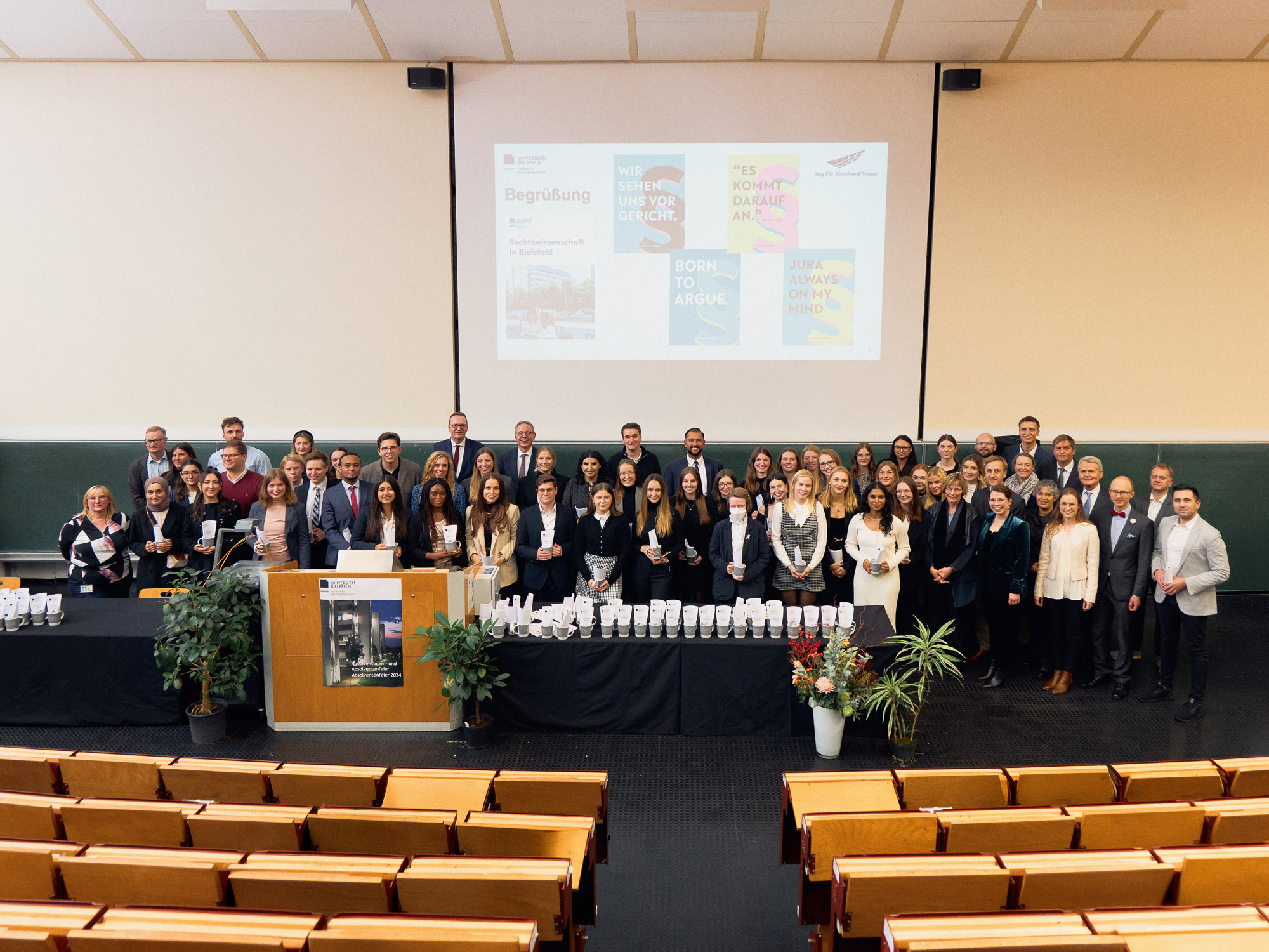Am 6. Dezember 2024 wurde Hörsaal H1 der Universität Bielefeld zur Bühne für einen besonderen Abend: Die Fakultät für Rechtswissenschaft verabschiedete ihre Absolvent*innen mit einer festlichen Feier. Im Rahmen des diesjährigen Tags für Absolvent*innen, an dem alle 2024 Graduierten der Universität geehrt wurden, bot die Fakultät ein abwechslungsreiches Programm. Inspirierende Reden, atmosphärische Musik und ein emotionaler Rückblick auf die Studienzeit machten den Abend zu einem besonderen Highlight – ein gebührender Abschied in festlicher Atmosphäre.