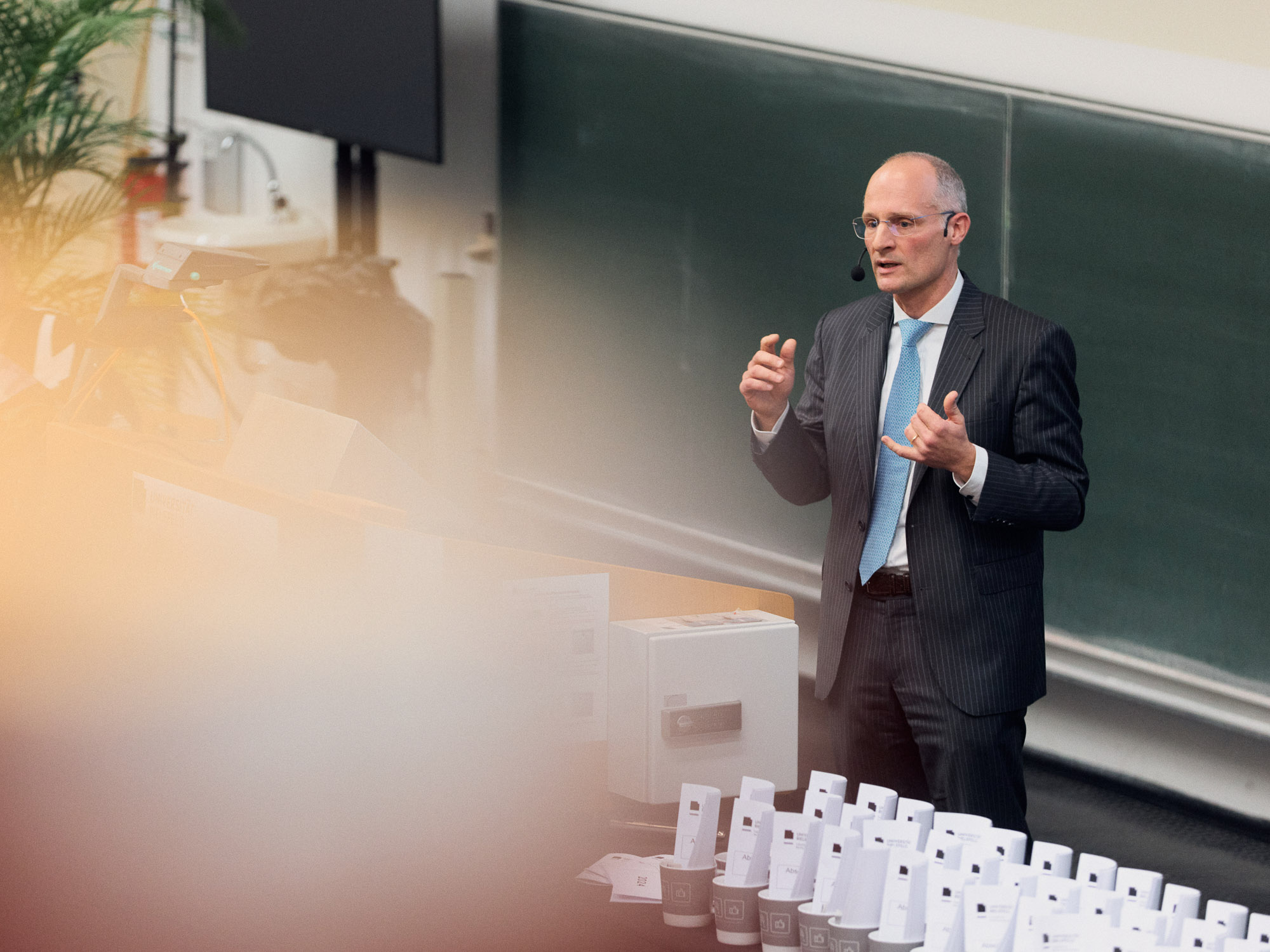 Klaus Petermann, Präsident des Landgerichts Bielefeld, hob den internationalen Ruf der deutschen Justiz hervor und lobte die Absolvent*innen für ihre Berufswahl. „Die Justiz ist ein gutes Berufsfeld, auf das man stolz sein kann“, sagte er und warb zeitglich für eine Karriere in der Justiz. In seiner Festrede stellte Rechtsanwalt Dr. Christoph Meyer-Rahe den Anwaltsberuf hingegen als abwechslungsreich und erfüllend dar. Mit Fingerspitzengefühl und juristischer Expertise bringe man Struktur in komplexe Sachverhalte und sei oft erste*r Ansprechpartner*in in rechtlichen Fragen.