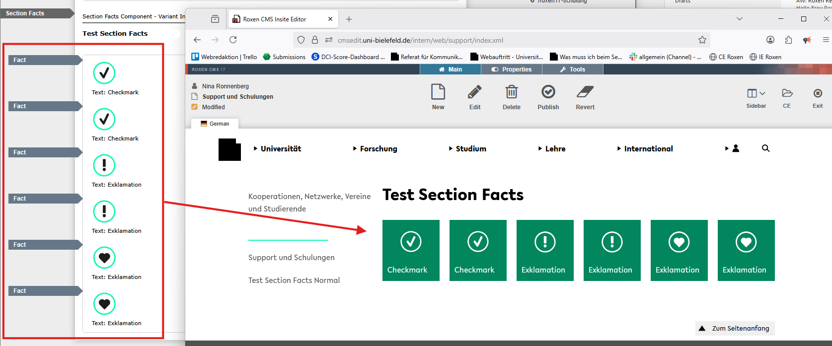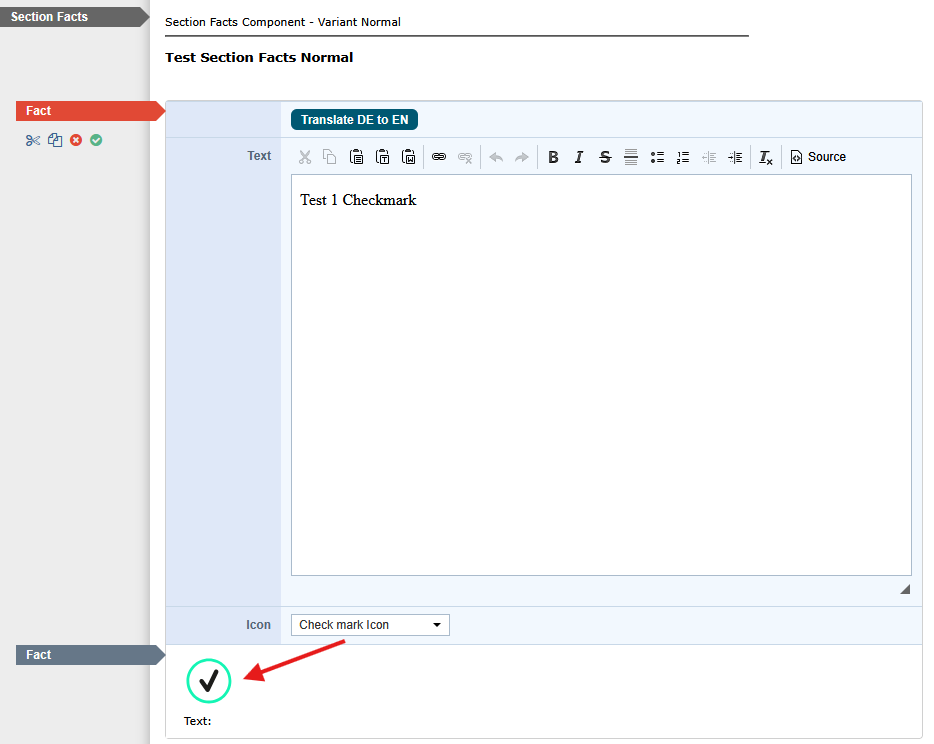 Anmerkung: Sie können die Symbole schon in dem Editor-Modus erkennen und müssen nicht aus dem Editor rausgehen. Dazu müssen sie nur aus der Facts Komponente in die Section Facts Komponente klicken.
