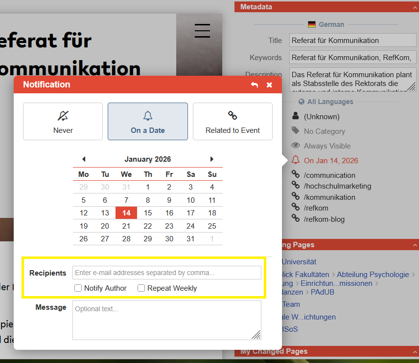 Hier können Sie auswählen, wie viele Tage bevor oder nach der Veröffentlichung, der eingeschalteten Sichtbarkeit oder abgeschalteten Sichtbarkeit eine Notifikation versendet werden soll. Sie können die Nachricht an eine E-Mail, oder an den/die Autor*in verschicken. Bei Bedarf auch wöchentlich.