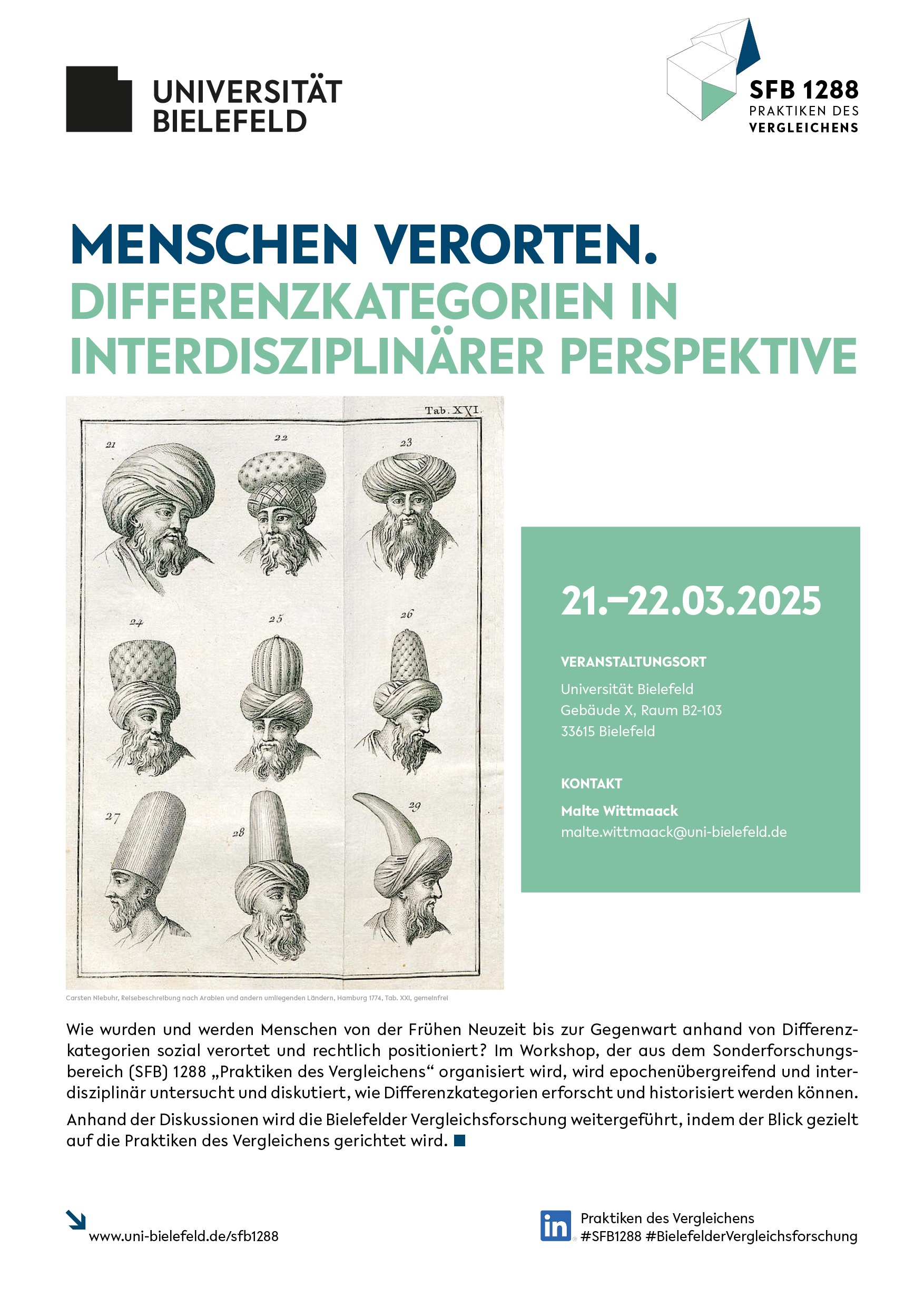 Wie wurden und werden Menschen von der Frühen Neuzeit bis zur Gegenwart anhand von Differenzkategorien sozial verortet und rechtlich positioniert? – Wir laden Sie herzlich dazu ein, sich unter anderem über diese Frage mit uns im Rahmen des Workshops „Menschen verorten. Differenzkategorien in interdisziplinärer Perspektive“ auszutauschen. Der Workshop wird von Mitgliedern der Bielefelder Vergleichsforschung vom 21.–22.03.2025 an der Universität Bielefeld ausgerichtet.