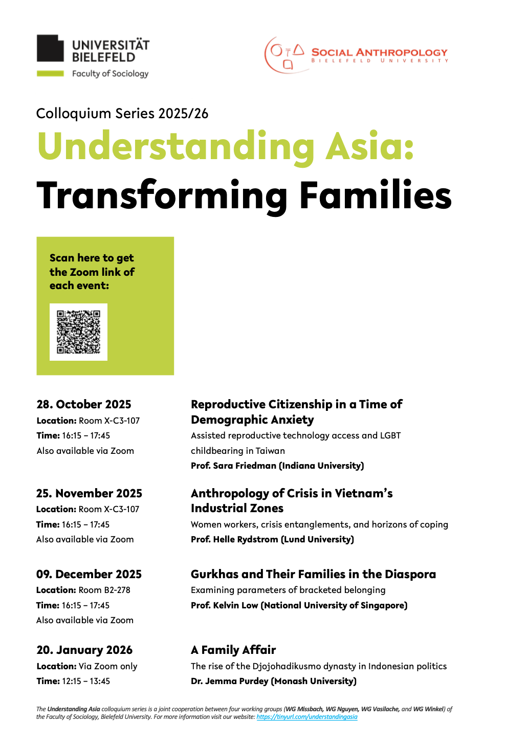 Prof. Sara Friedman (Indiana University), Prof. Helle Rydstrom (Lund University), and Prof. Kelvin Low (National University of Singapore) are coming to Bielefeld University to give their lectures in-person. The talk from Dr. Jemma Purdey (Monash University) is going to be via Zoom only.
