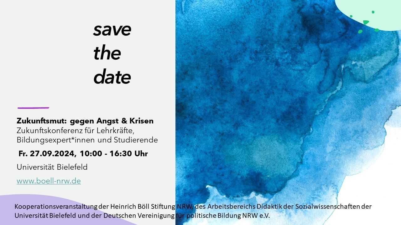 Am Freitag, den 27. September 2024, von 10:00 bis 16:30 Uhr, findet an der Universität Bielefeld eine Zukunftskonferenz für Lehrkräfte, Bildungsexpert*innen und Studierende statt. Unter dem Titel „Doing Future Together: Zukunftsmut gegen Angst & Krisen“ bietet die Veranstaltung eine Plattform, um gemeinsam Perspektiven und Lösungsansätze für eine unsichere Zukunft zu erarbeiten.