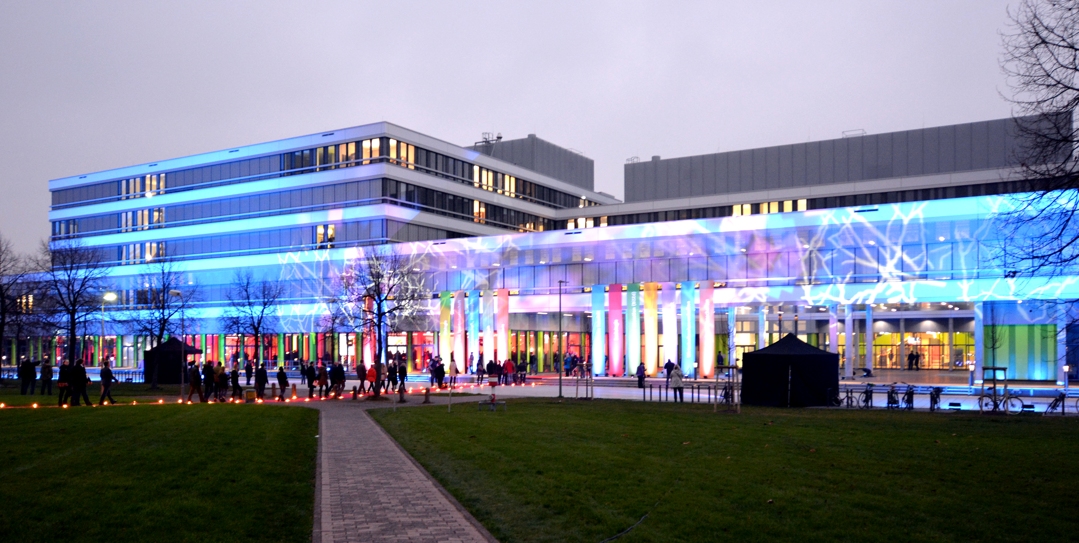 Das Gebäude X wird auch beim Absolvententag 2015 wie hier 2014 erstrahlen. Foto: Universität Bielefeld.