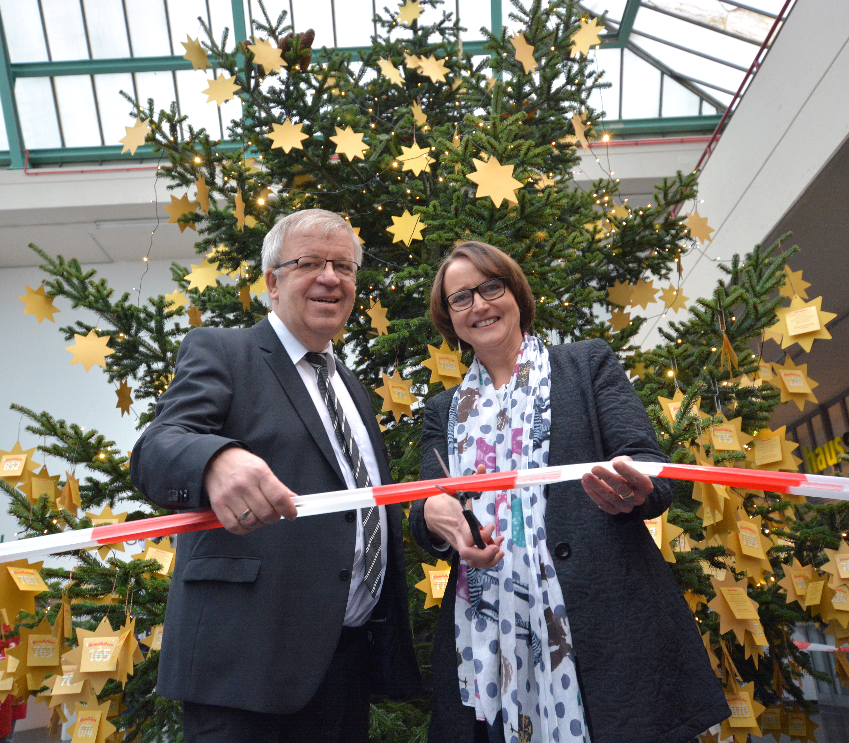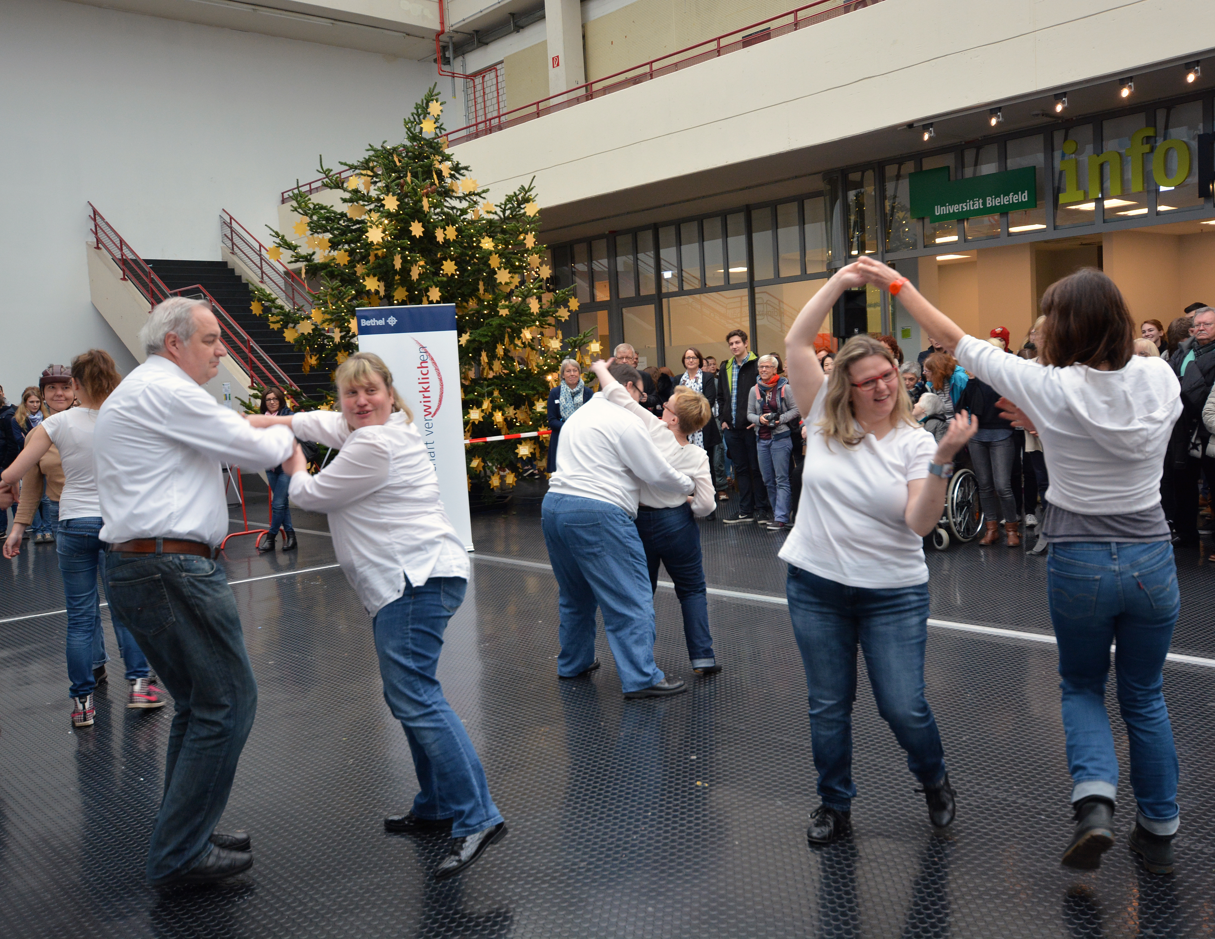 Am 23. November ist die Aktion Wunschstern in der Universitätshalle gestartet. Gegenüber dem Infopunkt wurde der Weihnachtsbaum mit goldenen Wunschsternen geschmückt. Studierende, Beschäftigte der Universität sowie Besucherinnen und Besucher können die Sterne pflücken und die auf ihnen stehenden Wünsche erfüllen. Die Musicaltanzgruppe der Neuen Schmiede/Bethel begleitete die Eröffnung mit Tänzen zu persönlichen Lieblingssongs. Der Startschuss für die Suche nach den Wünschen gaben Professorin Dr. Claudia Riemer, Prorektorin für Studium und Lehre, und Pastor Ulrich Pohl, Vorstandsvorsitzender von den Bodelschwinghschen Stiftungen Bethel.