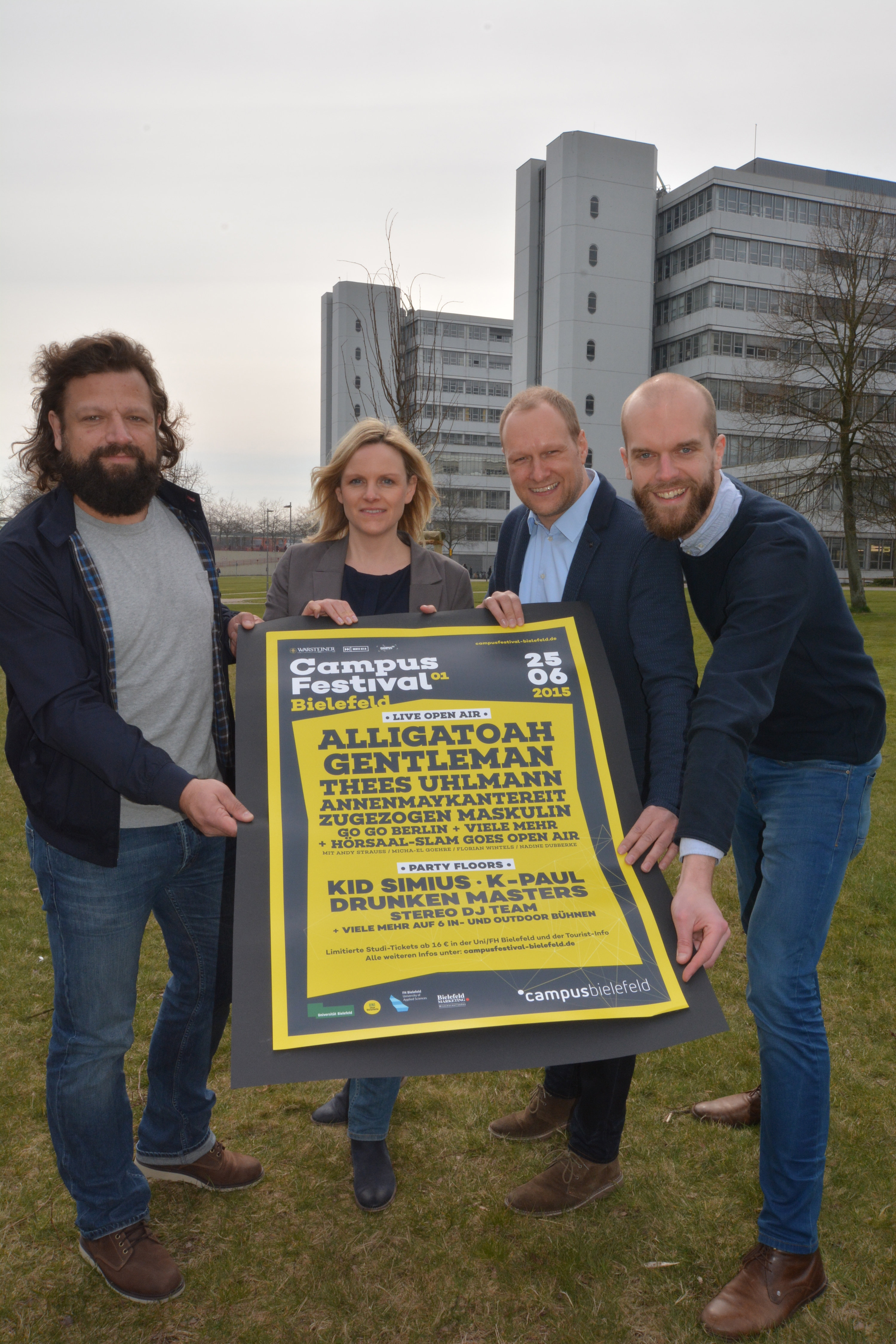 Am 25. Juni ist es soweit: Dann steigt das erste Campus-Festival Bielefeld. Auf mehreren Bühnen auf dem Campus Bielefeld treten namhafte Musik-Acts, Newcomer-Bands, DJs und regionale Gruppen auf. Das erstklassige Rock-, Pop- und Hip-Hop-Programm führen die Rapper Alligatoah, der Reggae-Star Gentleman und Deutschlands Indie-Ikone Thees Uhlmann an. Darüber hinaus sind zurzeit ebenfalls bestätigt: Annenmaykantereit, Zugezogen Maskulin und Go Go Berlin für die Live-Bühnen sowie Drunken Masters, Kid Simius und K-Paul (Lexy & K-Paul) für die DJ-Bühnen. Weitere Acts werden in Kürze folgen. Das Campus-Festival wird ausgerichtet in einer Kooperation von Universität Bielefeld, Fachhochschule Bielefeld und dem Wissenschaftsbüro von Bielefeld Marketing. Ausführender Veranstalter ist die Bielefelder Agentur Vibra. Tickets gibt es ab dem 7. April im Vorverkauf. Es gibt besondere Angebote für Studierende.