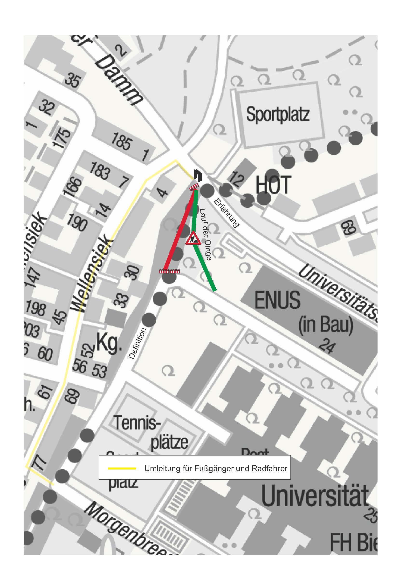 Erfahrung und Universitätsstraße/Definition bleibt komplett gesperrt. Eine Umleitung für Fußgänger und Radfahrer ist über den Wellensiek in beiden Richtungen ausgeschildert.
