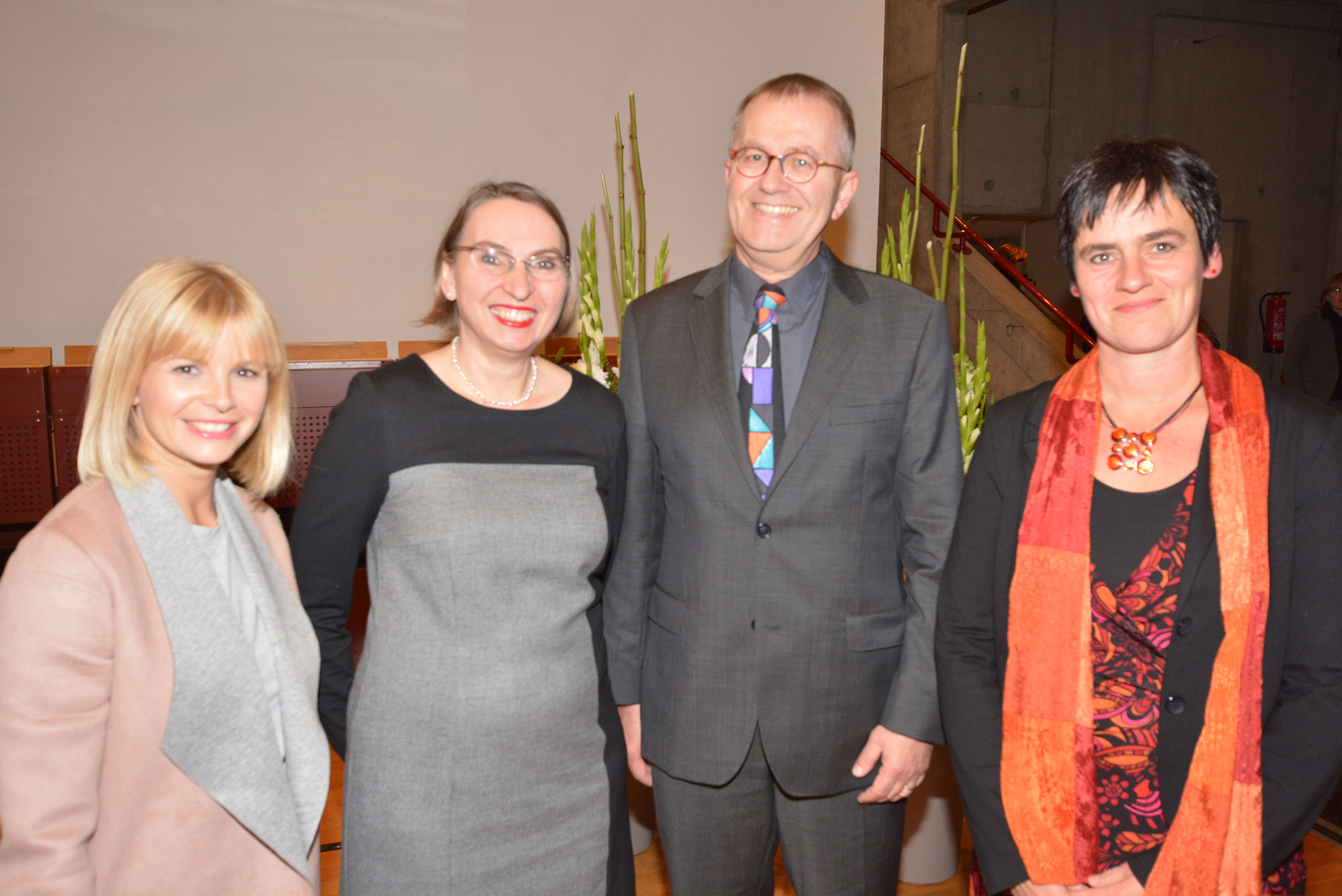 Gleichstellungspreis: Prorektor Prof. Martin Egelhaaf und die Gleichstellungsbeauftragte Uschi Baaken (l.) mit den Vertreterinnen der Fakultäten (v.l.) Katrin Velten (Gleichstellungskommission Erziehungswissenschaft) und Prodekanin Prof. Petra Kolip (Gesundheitswissenschaften). Foto: Universität Bielefeld