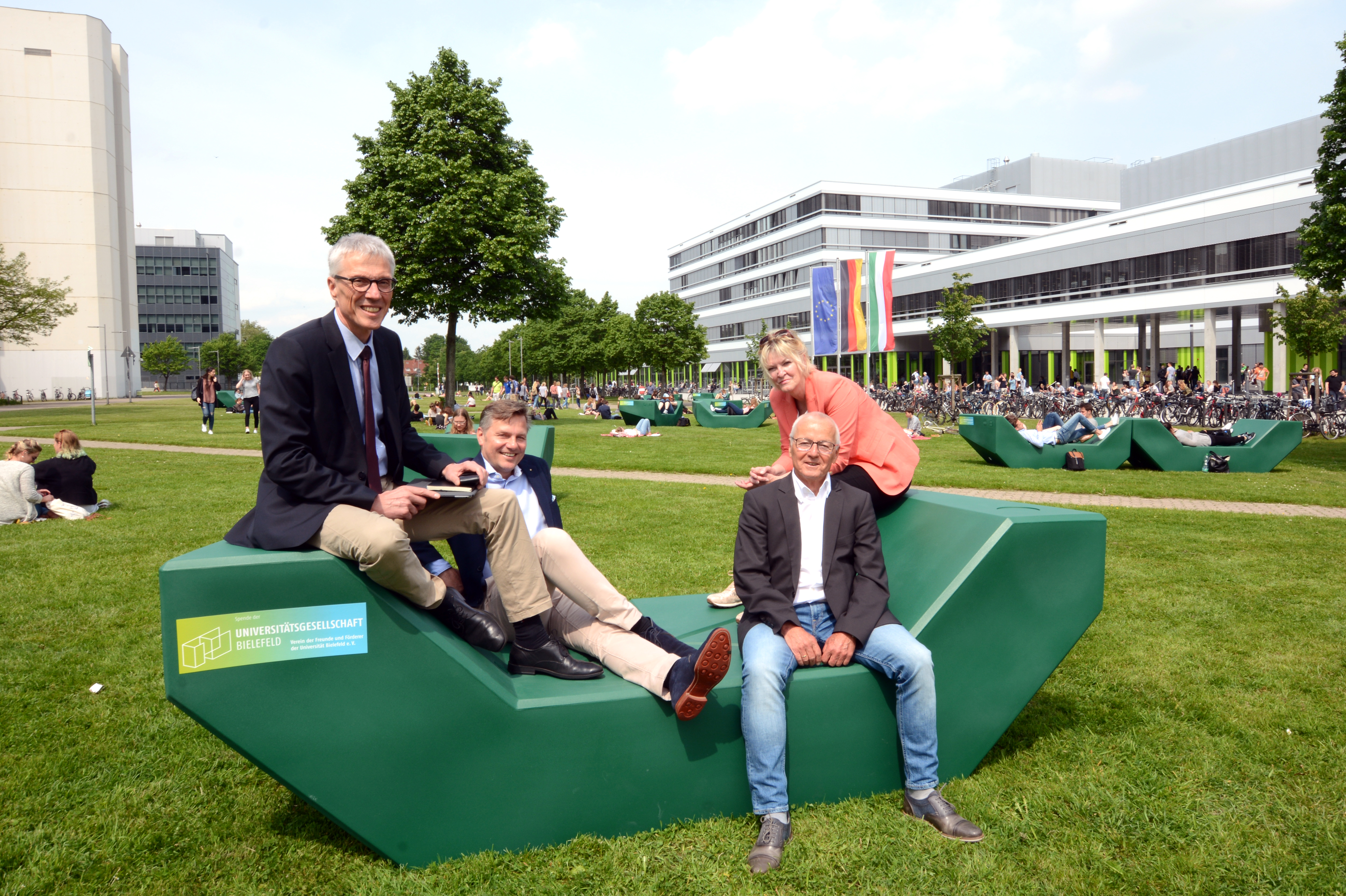 Neuheit auf dem Campus Bielefeld: Über 20 grün lackierte Sitzmöbel laden zwischen Gebäude X und Universitätshauptgebäude zum gemütlichen Sitzen oder Liegen ein. Eine Spende der Universitätsgesellschaft Bielefeld (UGBi) macht es möglich. Jürgen Heinrich, Geschäftsführendes Vorstandsmitglied der UGBi: „Wir Freunde und Förderer wollten zum 50-Jährigen unserer Gesellschaft der Universität Bielefeld ein Geschenk machen, das für alle da ist. Der Campus ist ein Quartier, in das täglich um die 30.000 Menschen pendeln. Da waren Möbel zum Sitzen, Liegen, Gedanken austauschen oder einfach genießen für uns die beste Idee."