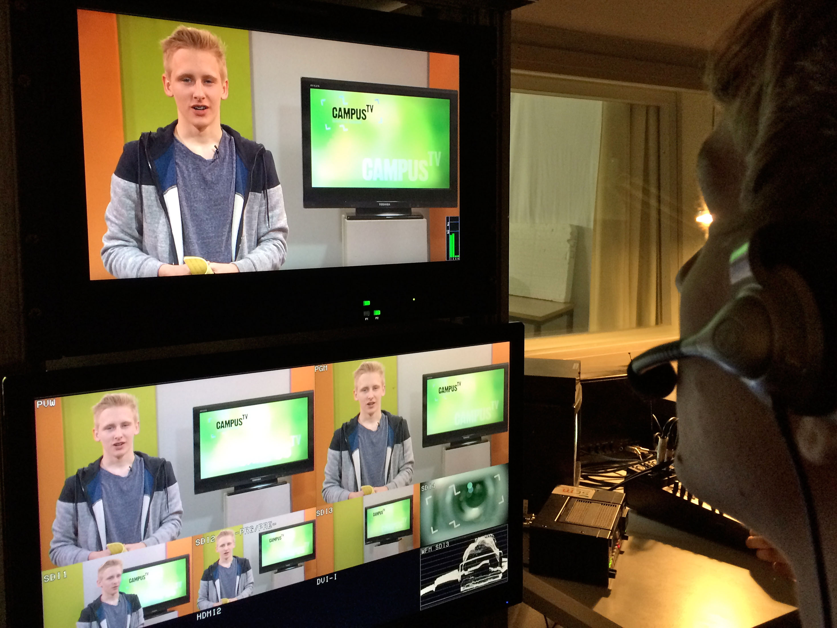 Bildregisseur Fabian Bien (r.) und Moderator Moritz bei der Aufzeichnung der 109. Ausgabe von Campus TV Foto: Campus TV / Jochen Kopp