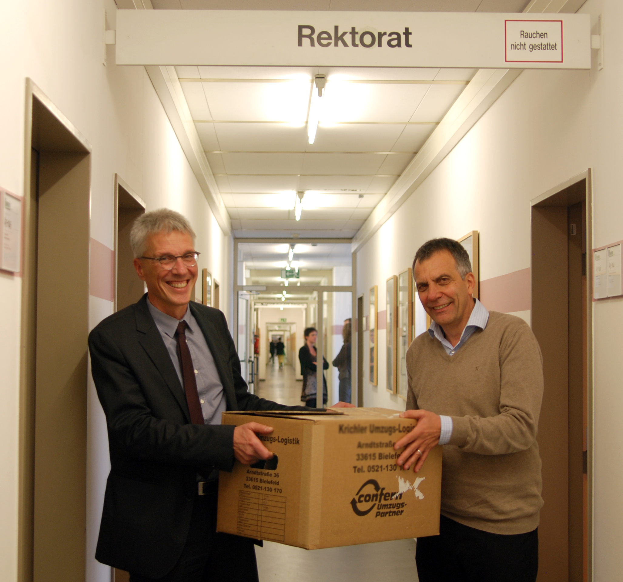 Kanzler Dr. Stephan Becker und Rektor Prof. Dr.-Ing. Gerhard Sagerer (v.l.) haben bereits ihre Sachen gepackt.