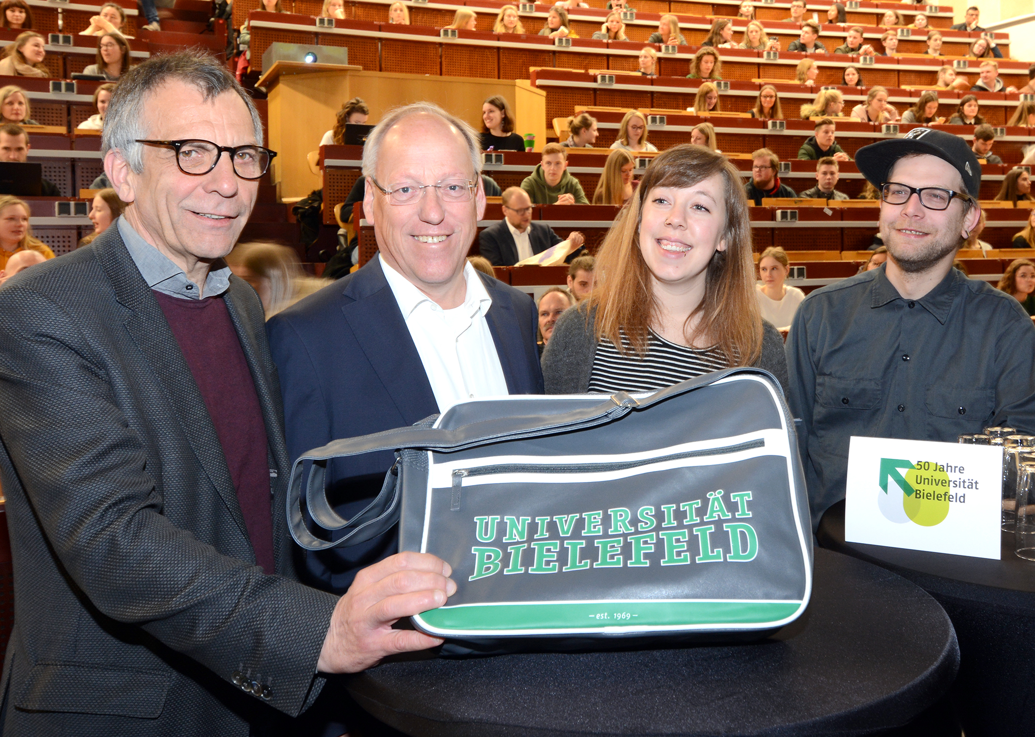 Heute (01.04.2019) beginnt die Vorlesungszeit des Sommersemesters 2019 an der Universität Bielefeld. Rektor Professor Dr.-Ing. Gerhard Sagerer, die Vorsitzenden des Allgemeinen Studierendenausschusses (AStA) Jana Freese und Sven Wolski sowie Bielefelds Oberbürgermeister Pit Clausen haben die neuen Studierenden im Hörsaal H1 willkommen geheißen.