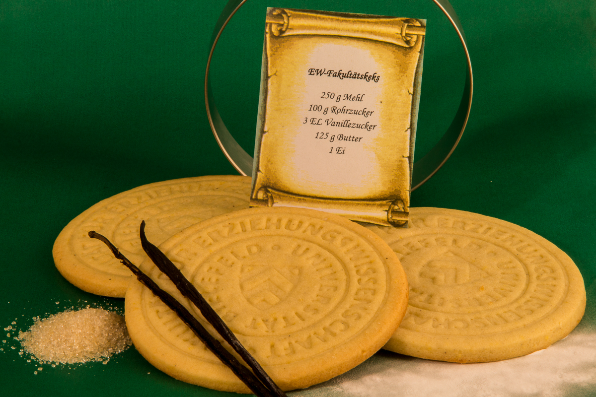 An der Fakultät für Erziehungswissenschaft gibt es in diesem Jahr erstmalig für jede Absolventin und jeden Absolventen den Fakultätskeks. Die Studienberaterin Dr. Odette Selders hat die Kekse selbst gebacken. Jeder Keks hat einen Durchmesser von etwa 11 cm.
