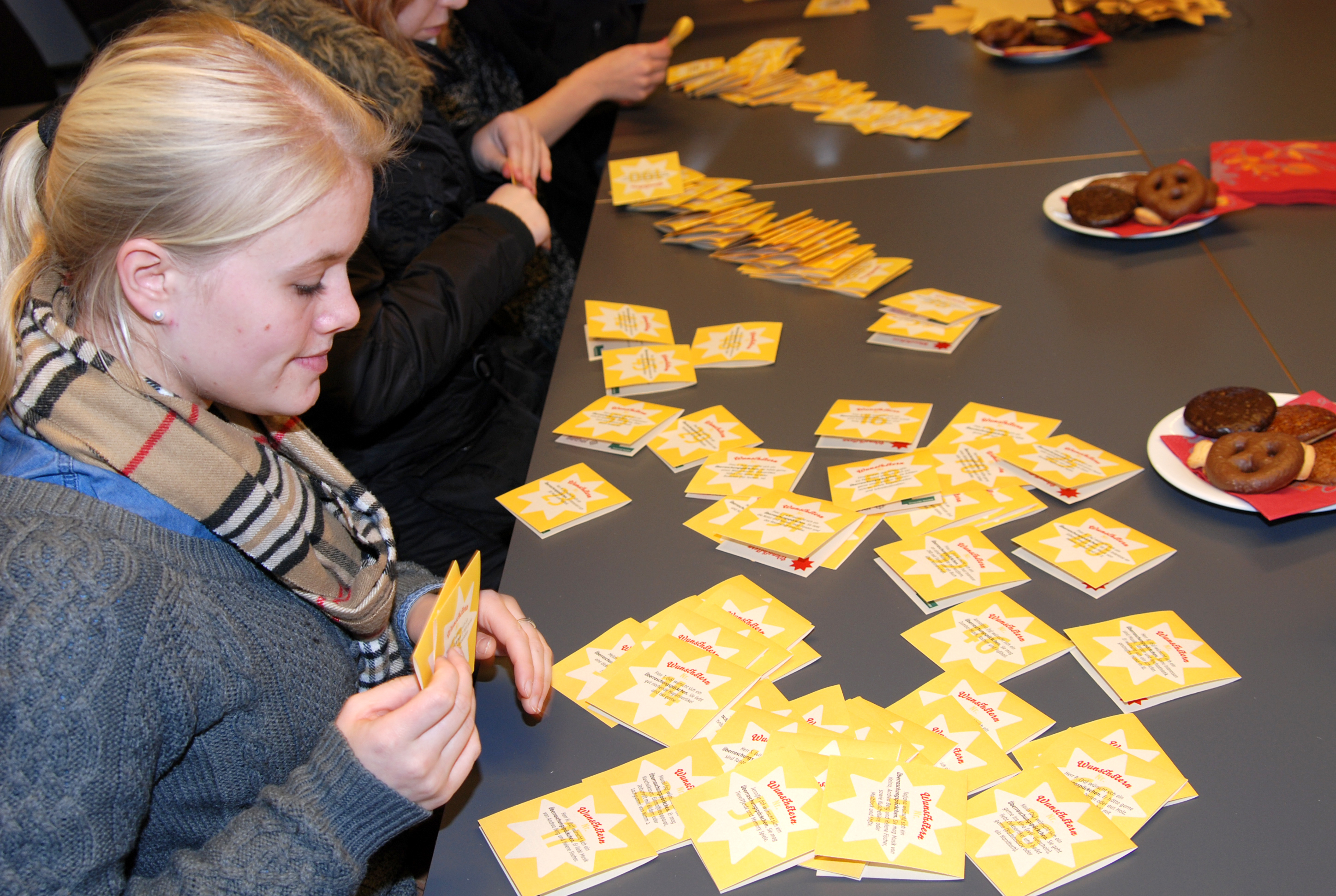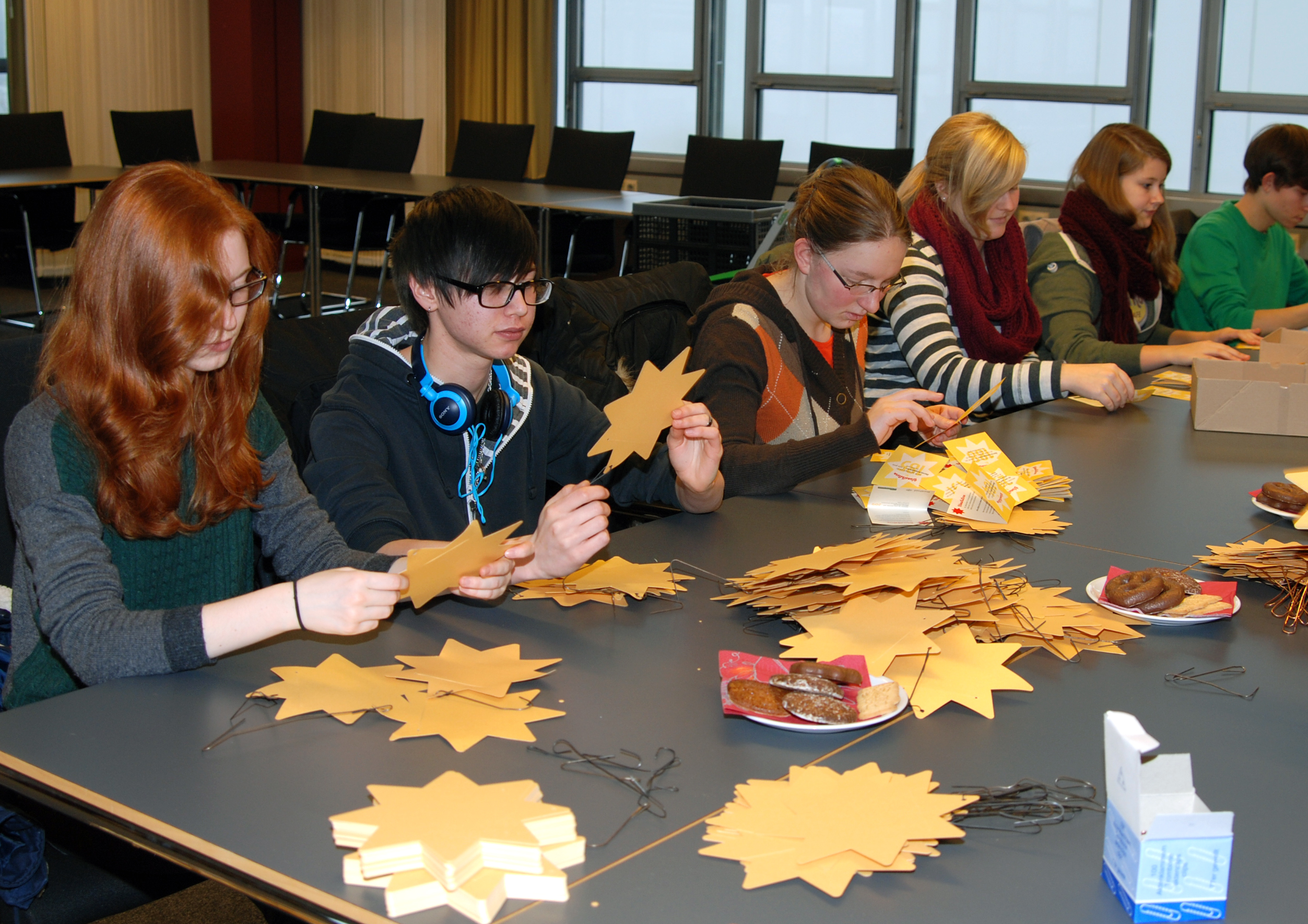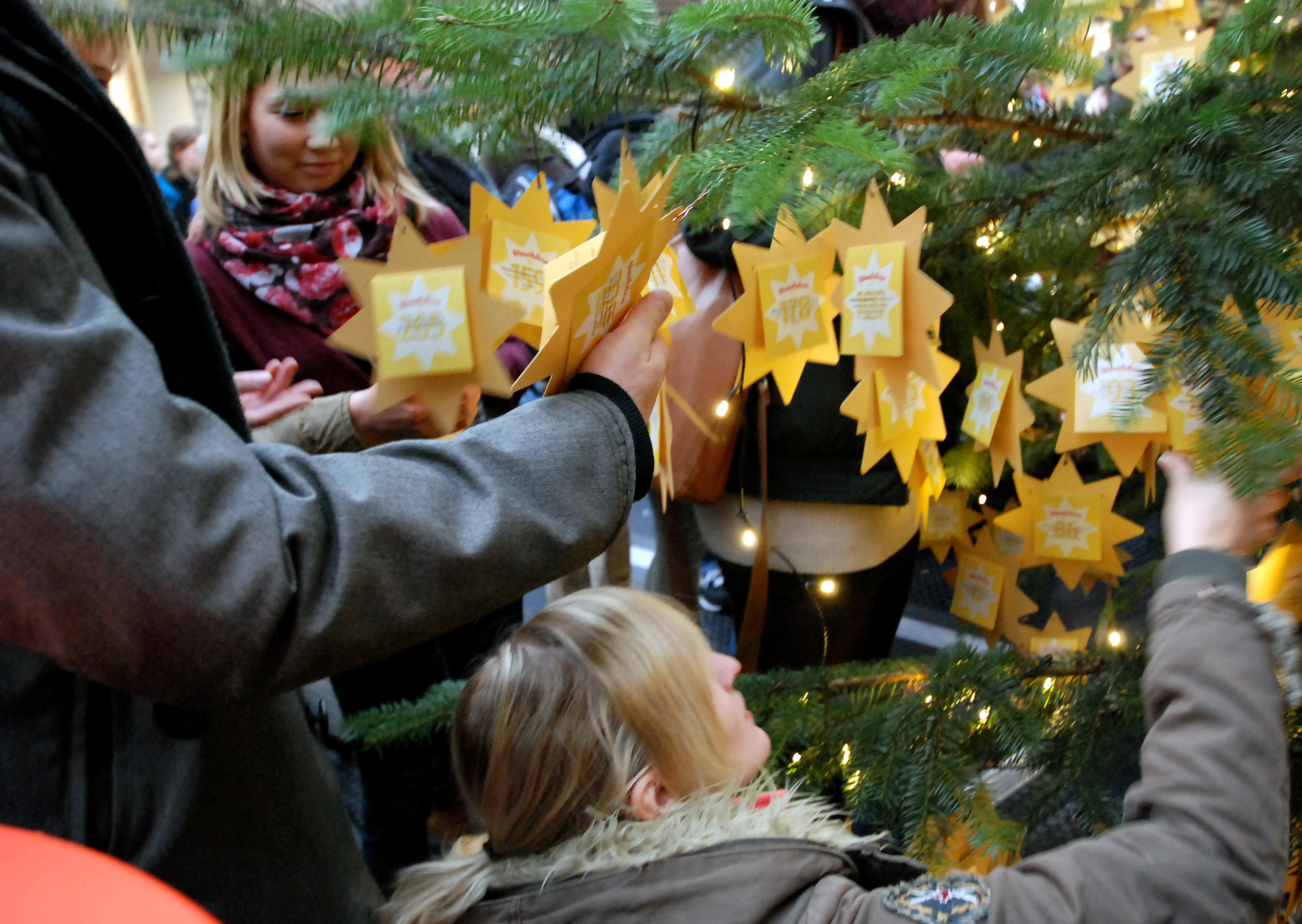 Eine Gruppe Auszubildender der Universität Bielefeld hat die goldenen Sterne mit den Wunschzetteln und den Aufhängern für den Baum versehen und den Baum geschmückt.