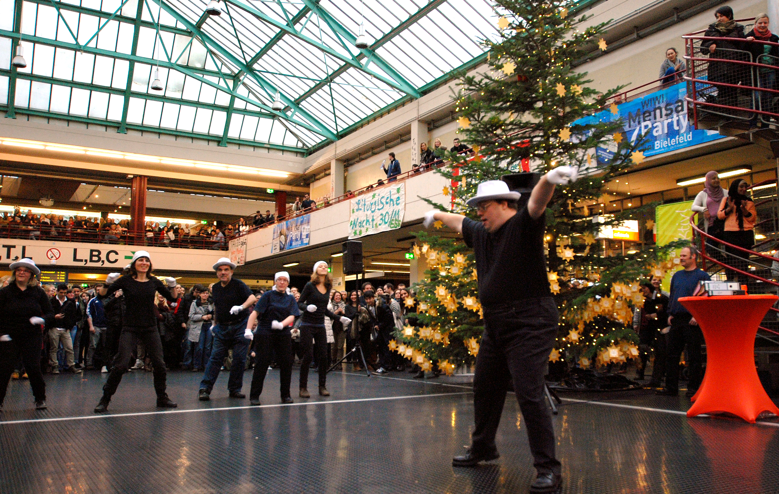 Eröffneten den Wunschbaum: Christian Kracht (Stadtwerke Bielefeld), Professorin Dr. Claudia Riemer (Prorektorin der Universität), Pastor Ulrich Pohl (Vorstandsvorsitzender der von Bodelschwinghschen Stiftungen Bethel) und Simon Krambs, Tänzer der Musicaltanzgruppe aus dem Freizeit- und Kulturzentrum Neue Schmiede.