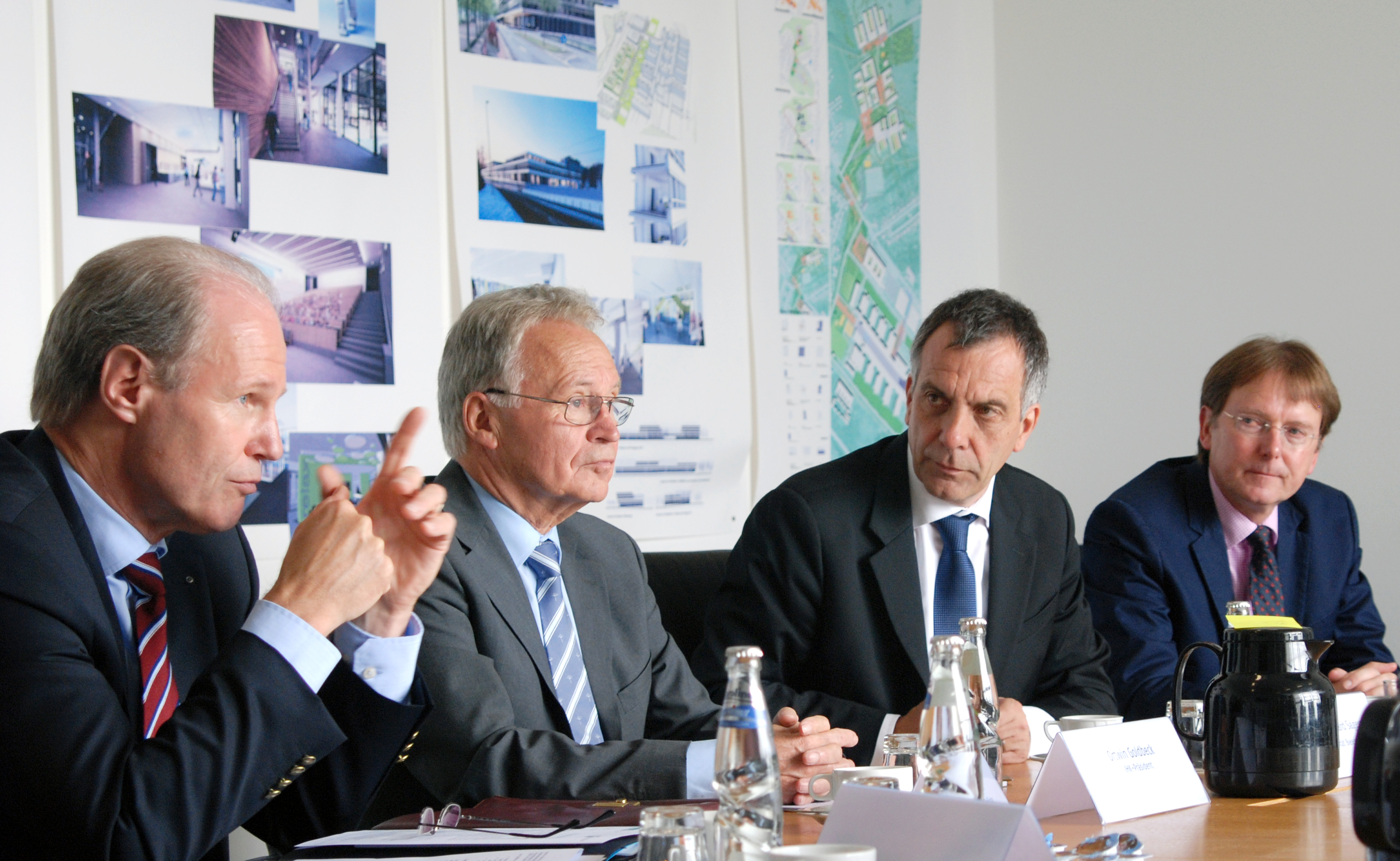 Stellten die Stiftungsprofessur vor: Thomas Niehoff, IHK-Hauptgeschäftsführer, Ortwin Goldbeck, IHK-Präsident, Prof. Dr.-Ing. Gerhard Sagerer, Rektor der Universität Bielefeld und Prof. Dr. Fred G. Becker, Fakultät für Wirtschaftswissenschaften (v.l.). Foto: Universität Bielefeld