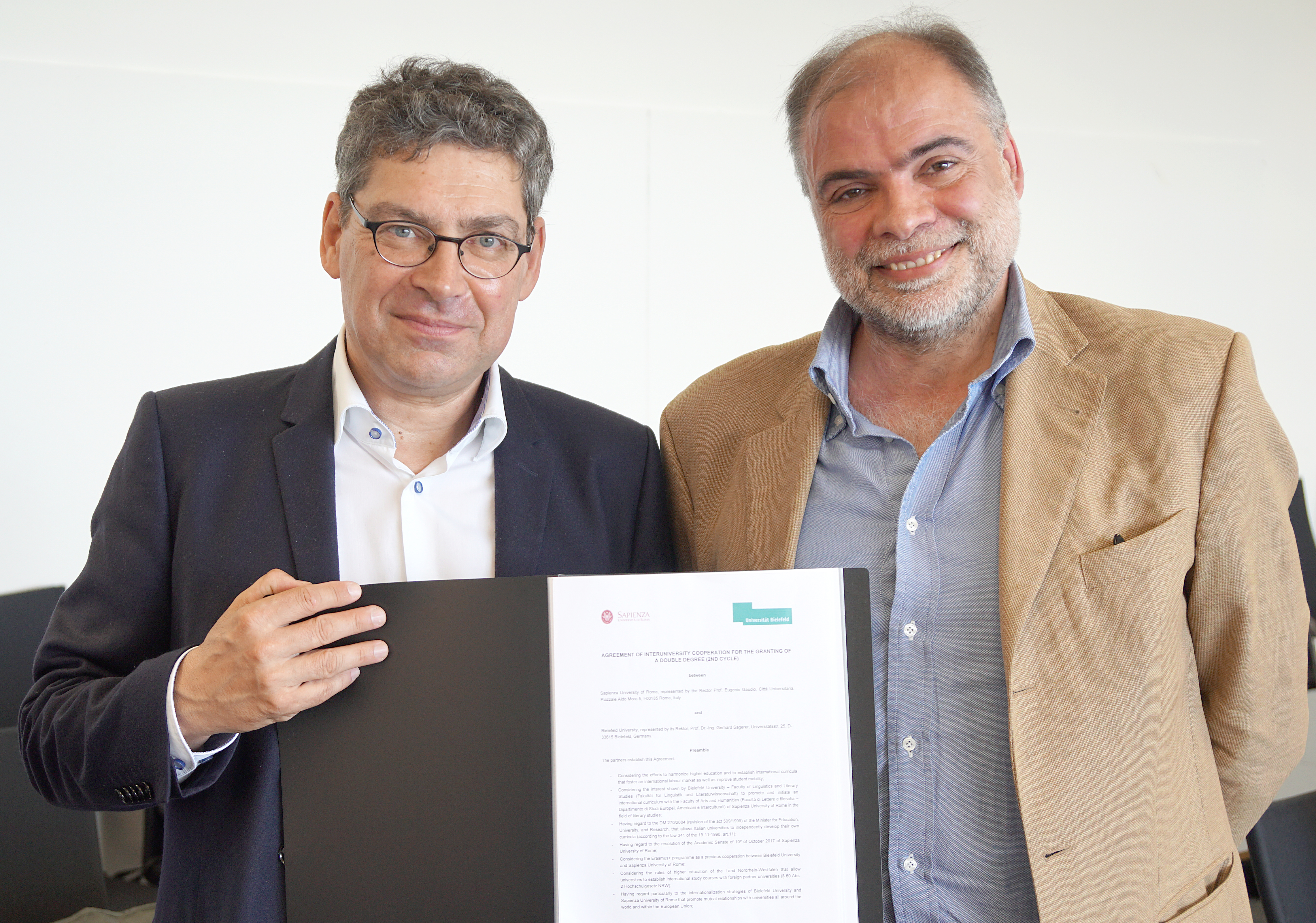 Einen internationalen Doppelabschluss der Universität Bielefeld und einer Universität in Mexiko beziehungsweise Italien erlangen: Das ermöglichen zwei neue Double-Degree-Studiengänge. Studierende können ab dem kommenden Wintersemester im deutsch-mexikanischen Masterstudiengang InterAmerican Studies / Estudios InterAmericanos in Zusammenarbeit mit der Universidad de Guadalajara und im deutsch-italienischen Masterprogramm in Literaturwissenschaft in Kooperation mit der Sapienza Università di Roma studieren. Gestern (04.06.2018) wurde in einer Feierstunde an der Universität Bielefeld der deutsch-italienische Partnerschaftsvertrag überreicht.