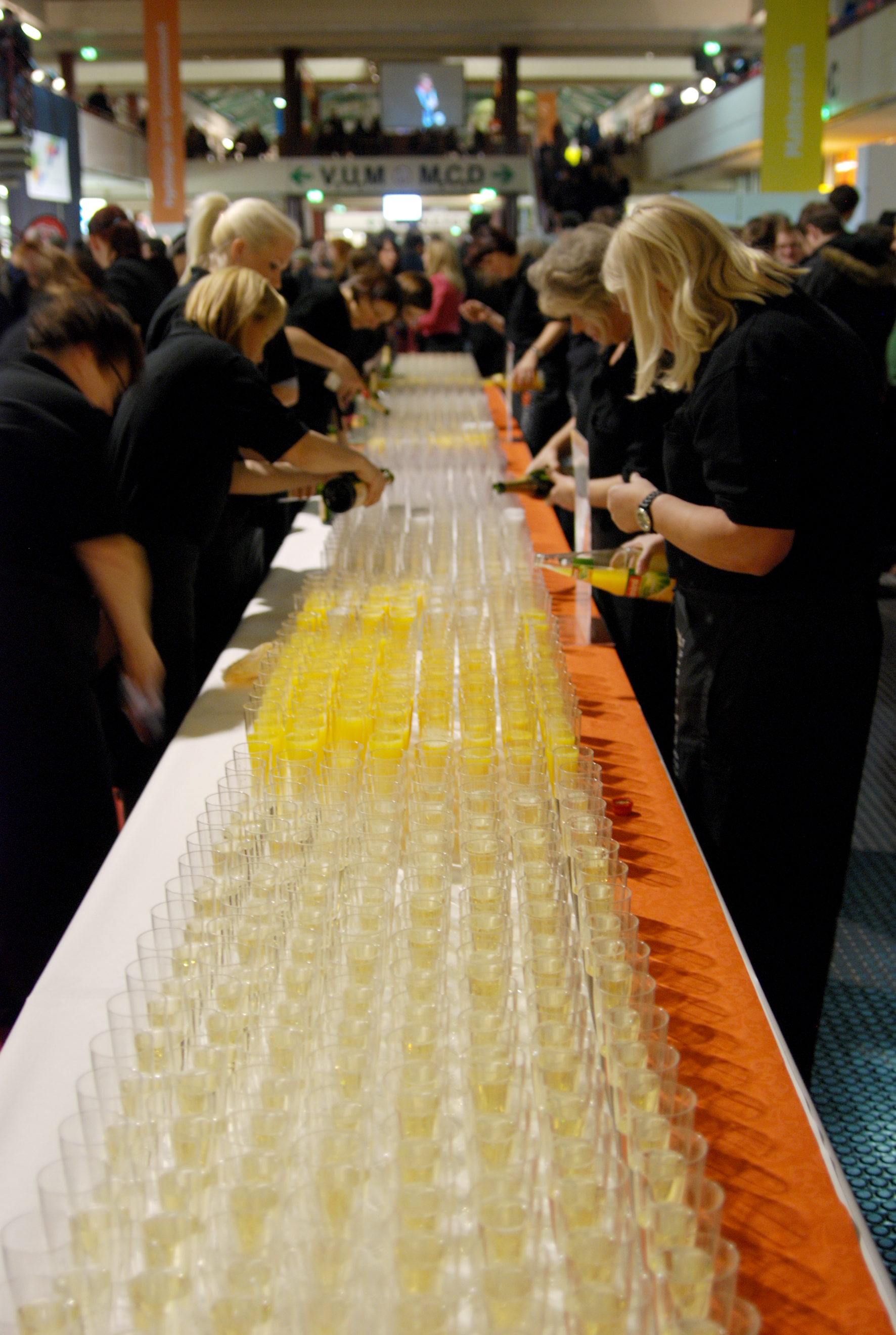 Auch in diesem Jahr haben die Mitarbeiterinnen und Mitarbeiter des Studentenwerks wieder alle Hände voll zu tun: Beim Absolvententag 2013 der Universität Bielefeld müssen sie für den Sektempfang rund 4.000 Gläser befüllen.