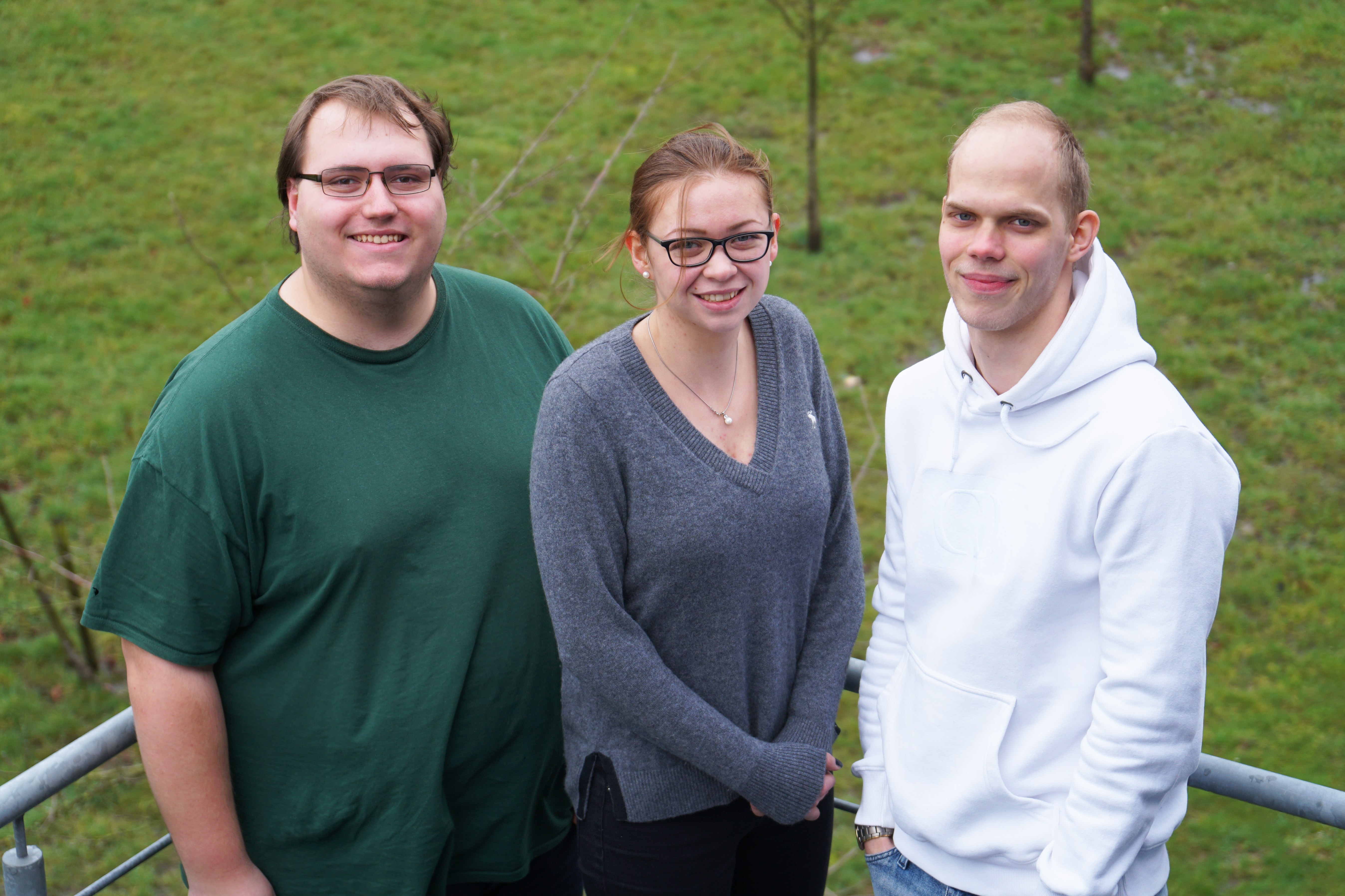 Andreas Haas (Systemelektroniker), Lena Rinke (Feinwerkmechanikerin) und Lars Kobuß (Feinwerkmechaniker) (v. l.) gehören zu den Absolvent*innen. Foto: Universität Bielefeld