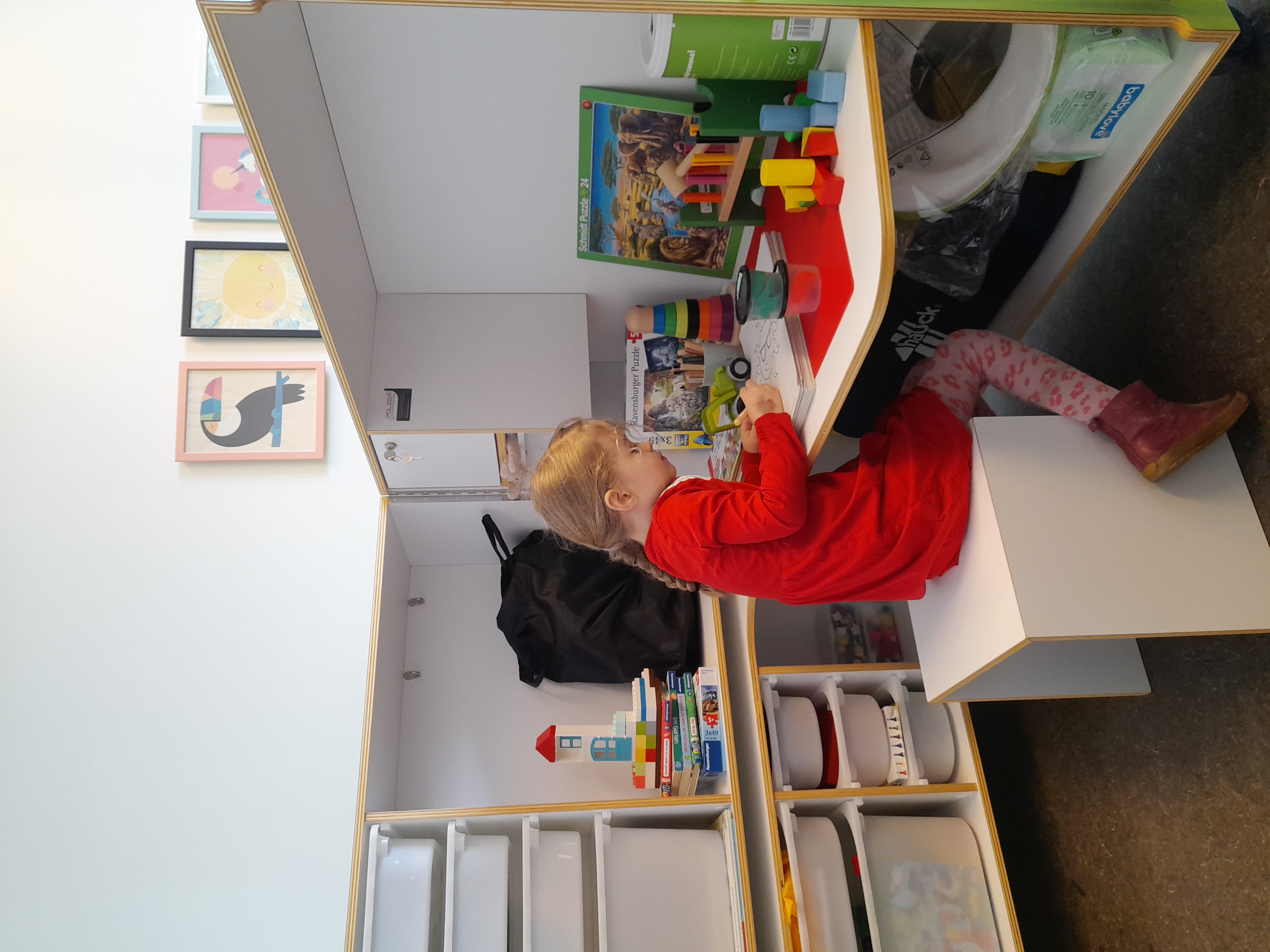 Die KidsBox kann an den Arbeitsplatz gerollt werden und verwandelt ihn kurzfristig in ein Eltern-Kind-Büro. Sie ist für Kinder bis ins Grundschulalter ausgestattet. Enthalten sind hilfreiche Materialien für die Versorgung von Babys wie Kinderbett und Wickelutensilien, aber auch für größere Kinder Spiel- und Malsachen, Puzzles, Bücher etc. Wenn sie im 90 Grad-Winkel aufgebaut wird, benötigt die KidsBox etwa eine Stellfläche von 1,40 m x 1,40 m. Zusammengeklappt ist die Box 1,10 m breit, 1,23 m hoch und 66 cm tief. Dadurch ist sie gut rollbar und mit dem Fahrstuhl transportierbar.