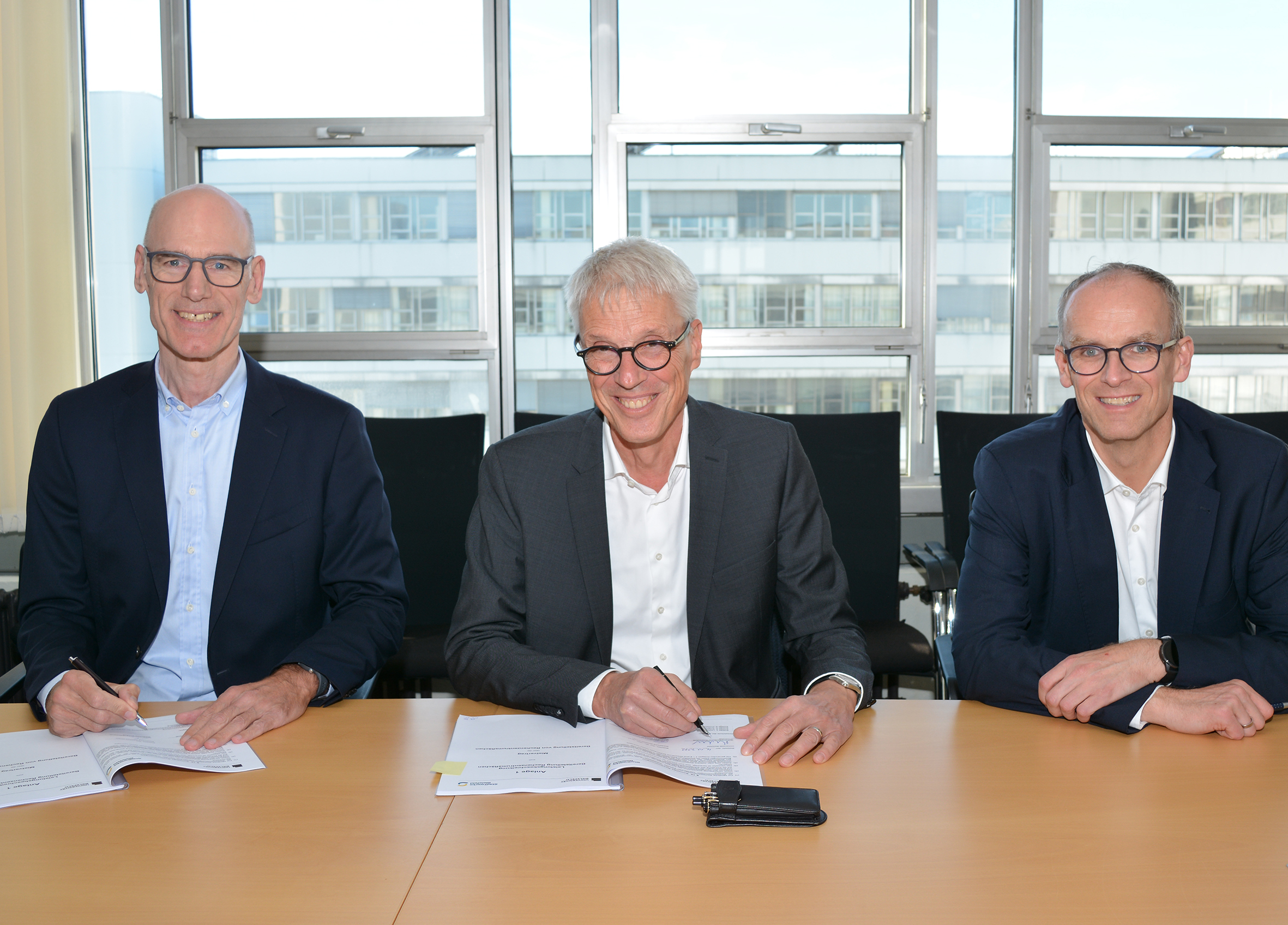 Freuen sich über die Vertragsunterzeichnung (v.l.): Stadtwerke-Geschäftsführer Rainer Müller, Dr. Stephan Becker (Kanzler der Universität Bielefeld), und Stadtwerke-Geschäftsführer Martin Uekmann. Foto: Universität Bielefeld