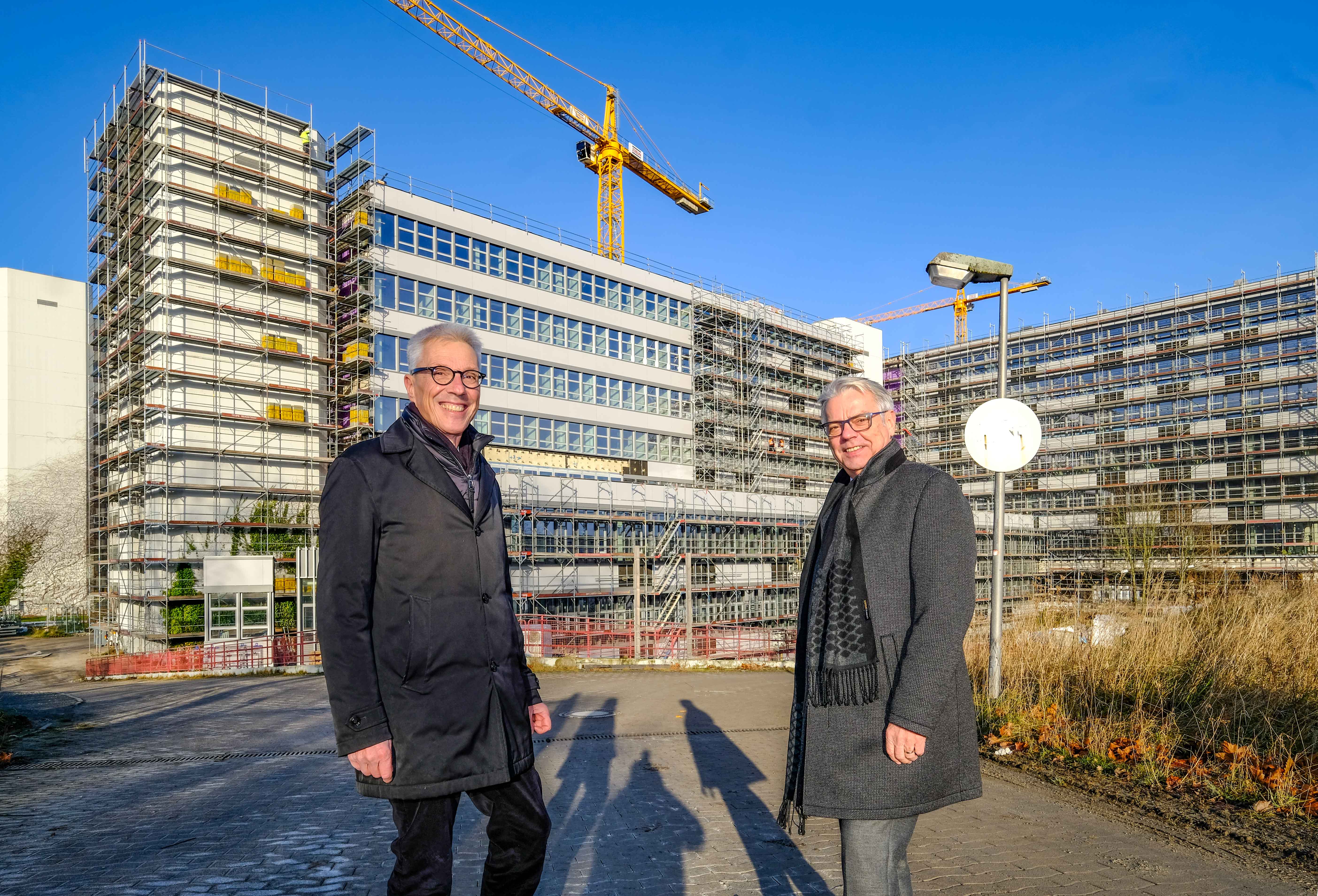 Erst Mitte letzten Jahres wurde die ehemalige Mensa am Universitätshauptgebäude (UHG) abgerissen. Anschließend wurden Bohrpfähle gesetzt und im vergangenen November die Baustellenkräne aufgestellt. Heute, rund ein Jahr später, sind die Betonarbeiten abgeschlossen und der Rohbau für den ersten Bauabschnitt fertiggestellt. „Normalerweise ist so ein wichtiger Meilenstein ein Anlass für ein zünftiges Richtfest, um insbesondere den Leuten vom Bau für ihren Einsatz und ihre Arbeit zu danken, aber auch um die erfolgreiche Zusammenarbeit mit der Universität und die tolle Leistung des Projektteams zu würdigen“, sagt Wolfgang Feldmann, der technische Leiter der Bielefelder BLB NRW-Niederlassung. „Leider lässt das die aktuelle Corona-Situation nicht zu.“ Stattdessen trafen sich die Beteiligten des BLB NRW und der Universität Bielefeld am Freitag in besonders kleiner Runde zu einer Begehung des Rohbaus. Nicht fehlen durfte dabei ein kleiner, symbolischer Richtkranz.