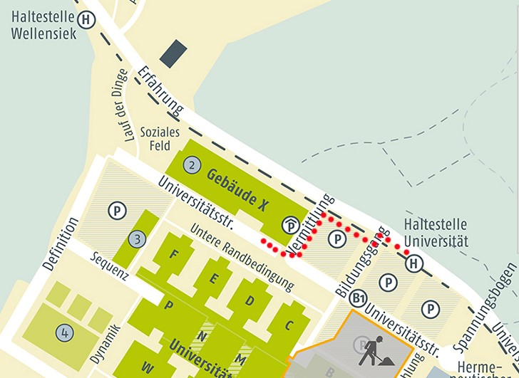 Der Weg von der Stadtbahnhaltestelle „Universität“ zum Gebäude X verändert sich. Ein neu angelegter Fußweg durch das Parkhaus soll zukünftig sicher in das Gebäude X führen. Dafür wird Mobiel den Weg unterhalb der Fußgängerbrücke öffnen. Geplant ist, diese Maßnahme bis zum Wintersemester 2017/2018 abzuschließen. Gleichzeitig soll auch der barrierefreie Eingang in C01 aufgewertet werden.