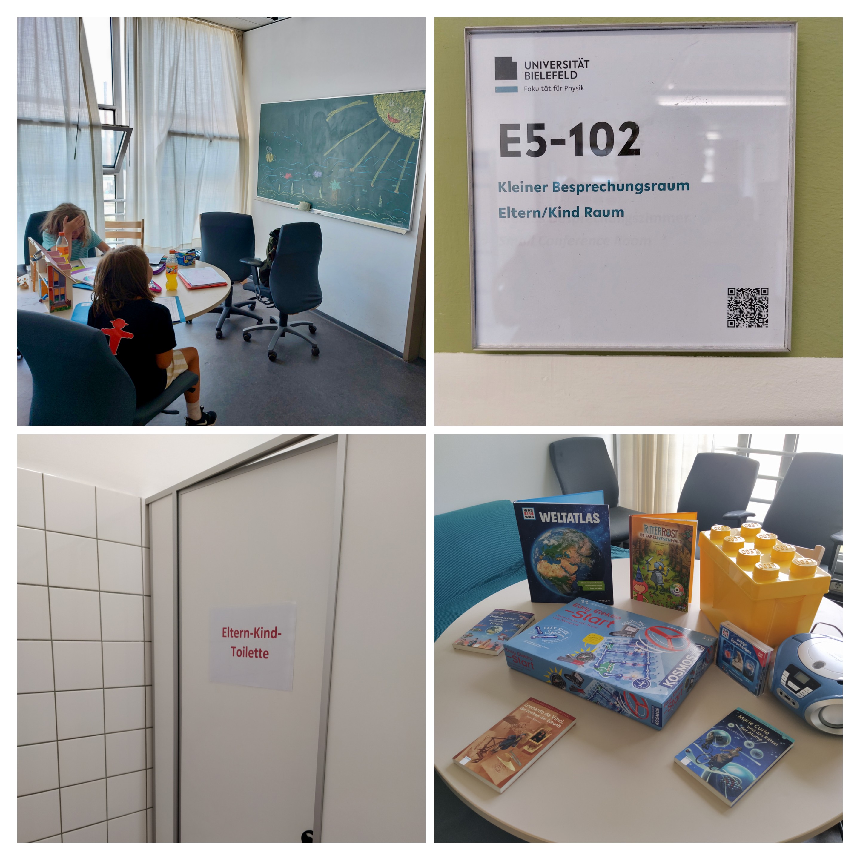 Eine gemütliche blaue Couch, ein Tisch mit Trip-Trap-Stühlen, eine Kreide-Tafel, (Hör)-Bücher und jede Menge Kinderspielzeug. Unter Letzterem befindet sich natürlich auch ein „Easy Elektro Starter Set“. „Schließlich befinden wir uns ja in der Fakultät für Physik“, sagt Professor Dr. Jürgen Schnack mit einem Augenzwinkern. Das von ihm und der Arbeitsgruppe „Kondensierte Materie“ auf E5 eingerichtete Eltern-Kind-Zimmer bietet auf kleinem Raum alles, was ältere Kindergarten- und Schulkinder brauchen, um in Ruhe Hausaufgaben machen zu können oder zu spielen.