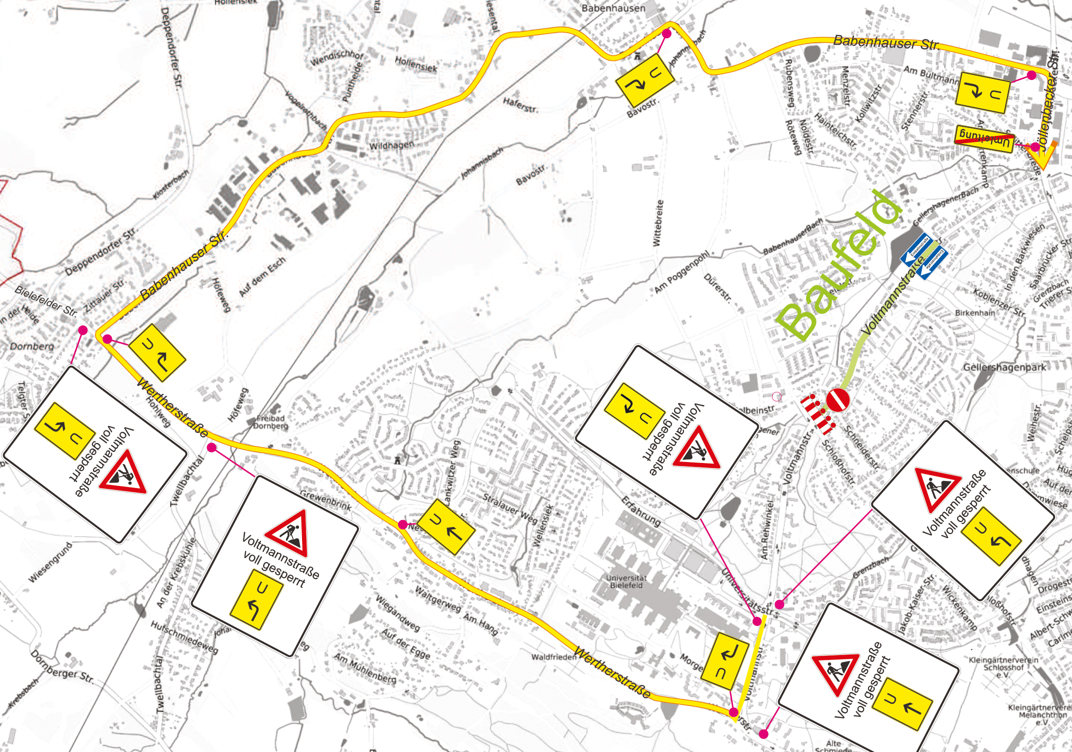 Im Vorfeld des geplanten Straßenneubaus der Voltmannstraße müssen die Stadtwerke neue Leitungen verlegen. Die Voltmannstraße ist deshalb seit Montag, 27. Februar, bis voraussichtlich Freitag, 14. Juli, zwischen der Hainteichstraße und der Schloßhofstraße Einbahnstraße. Die Fahrtrichtung von der Jöllenbecker Straße zur Universität bleibt befahrbar. Für die Gegenrichtung wird eine großräumige Umleitung (U 6) über die Wertherstraße und die Babenhauser Straße ausgeschildert.