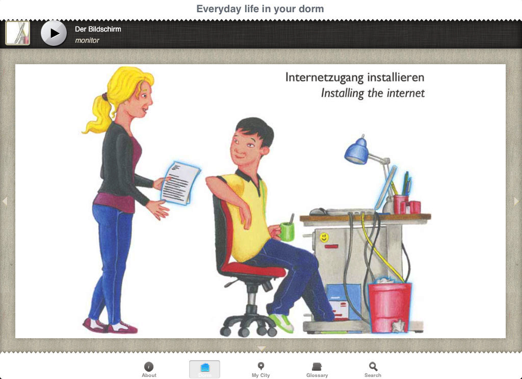 The app follows the style of the illustrated dorm dictionary and shows pictures of typical everyday situations in a student’s life. By selecting one of the highlighted objects in the pictures, you can see the German word together with an English and Chinese translation. The programme even offers a pronunciation aid – all German translations are available as audio files. The illustrated dorm dictionary also provides a glossary containing translations of more than 300 further words and sentences. The ‘My City’ feature provides important addresses and telephone numbers to make life easier for international students.
