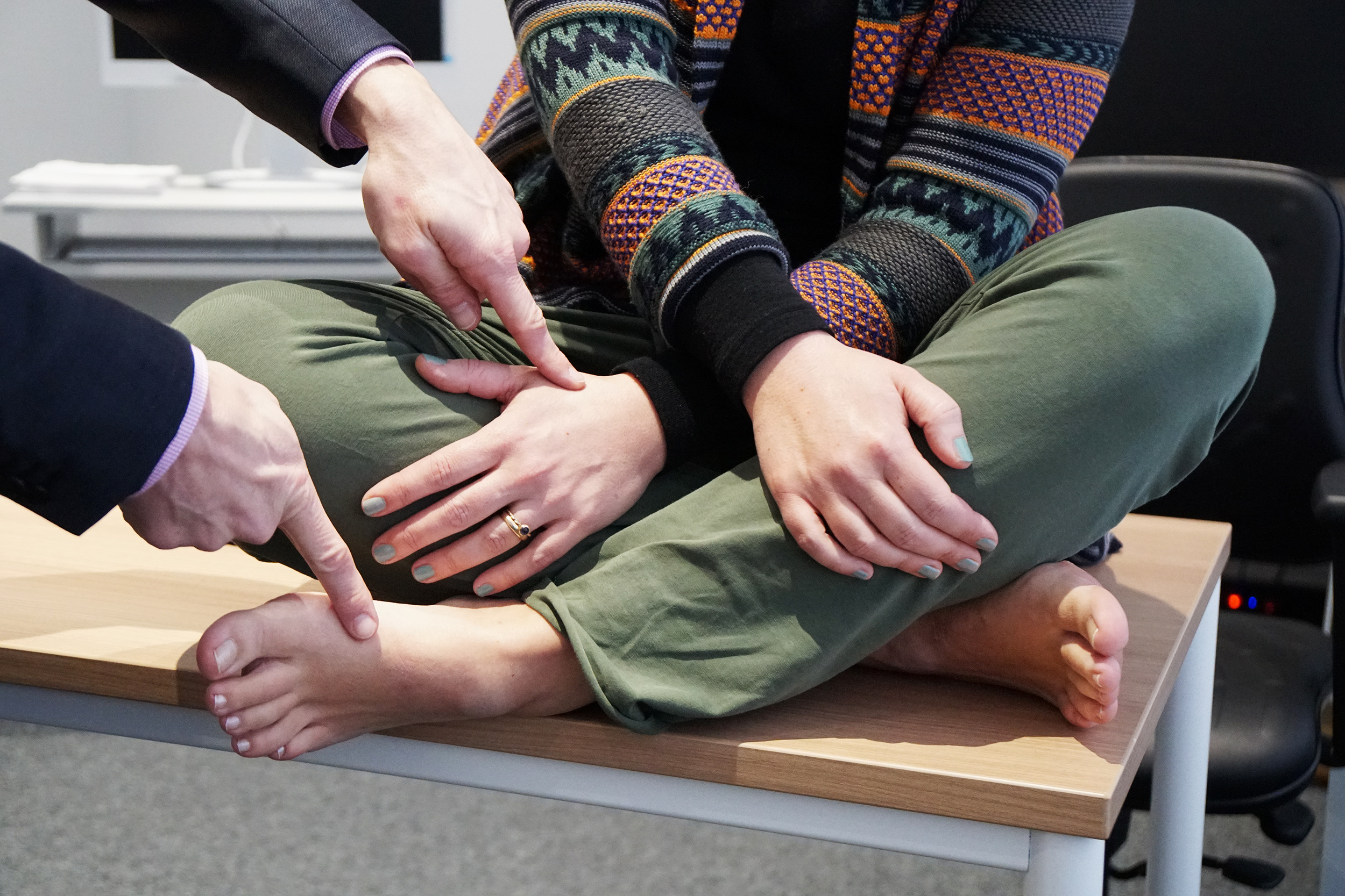 When one’s hands and feet are crossed, a touch on the right hand can be felt to have been on the right foot. Photo: Bielefeld University.