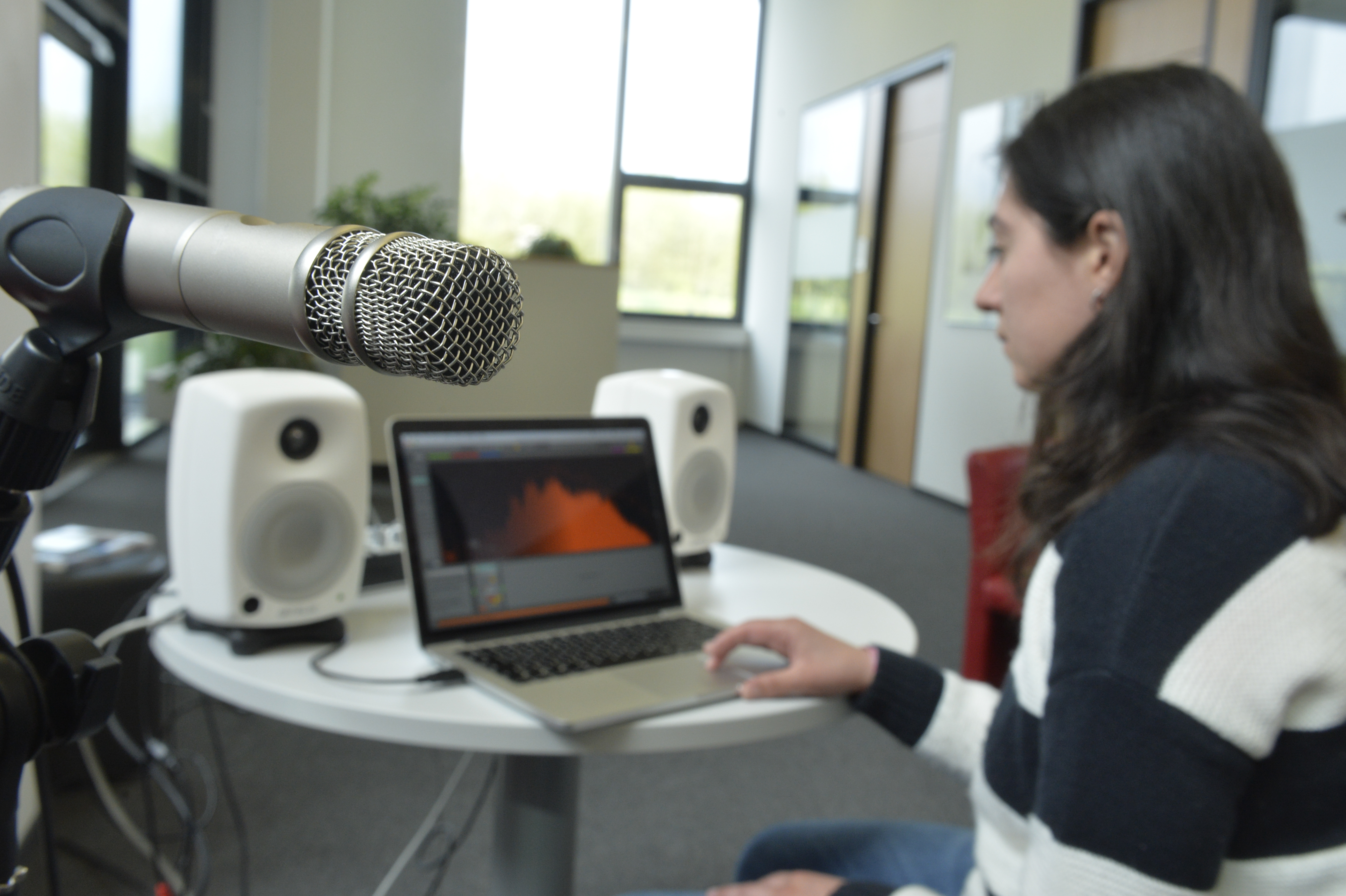The Soundscape Refiner provides a sonically protected space for visitors who want to get away from the noise of the trade fair. It records noise from the surroundings, turning it into pleasant background sound in real time that is then played over the speakers. In places where there are many conversations going on at the same time, the Soundscape Refiner overlaps the noises to create a subjectively harmonious background sound.