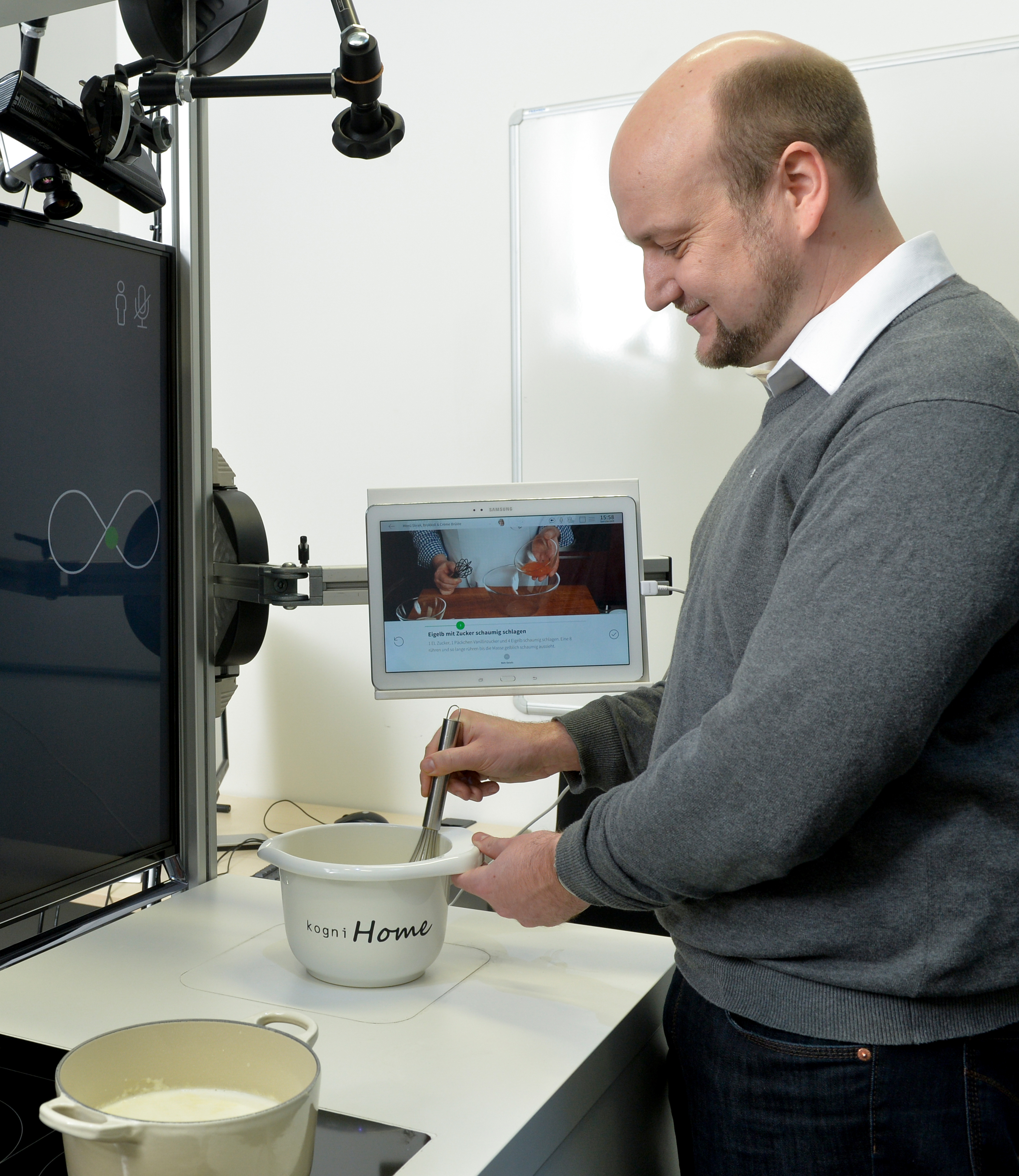 The cooking assistant KogniChef ensures that each recipe turns out a success. An integrated tablet that can be operated by voice or gesture leads the user step-by-step through the recipe. Photo: CITEC/Bielefeld University.