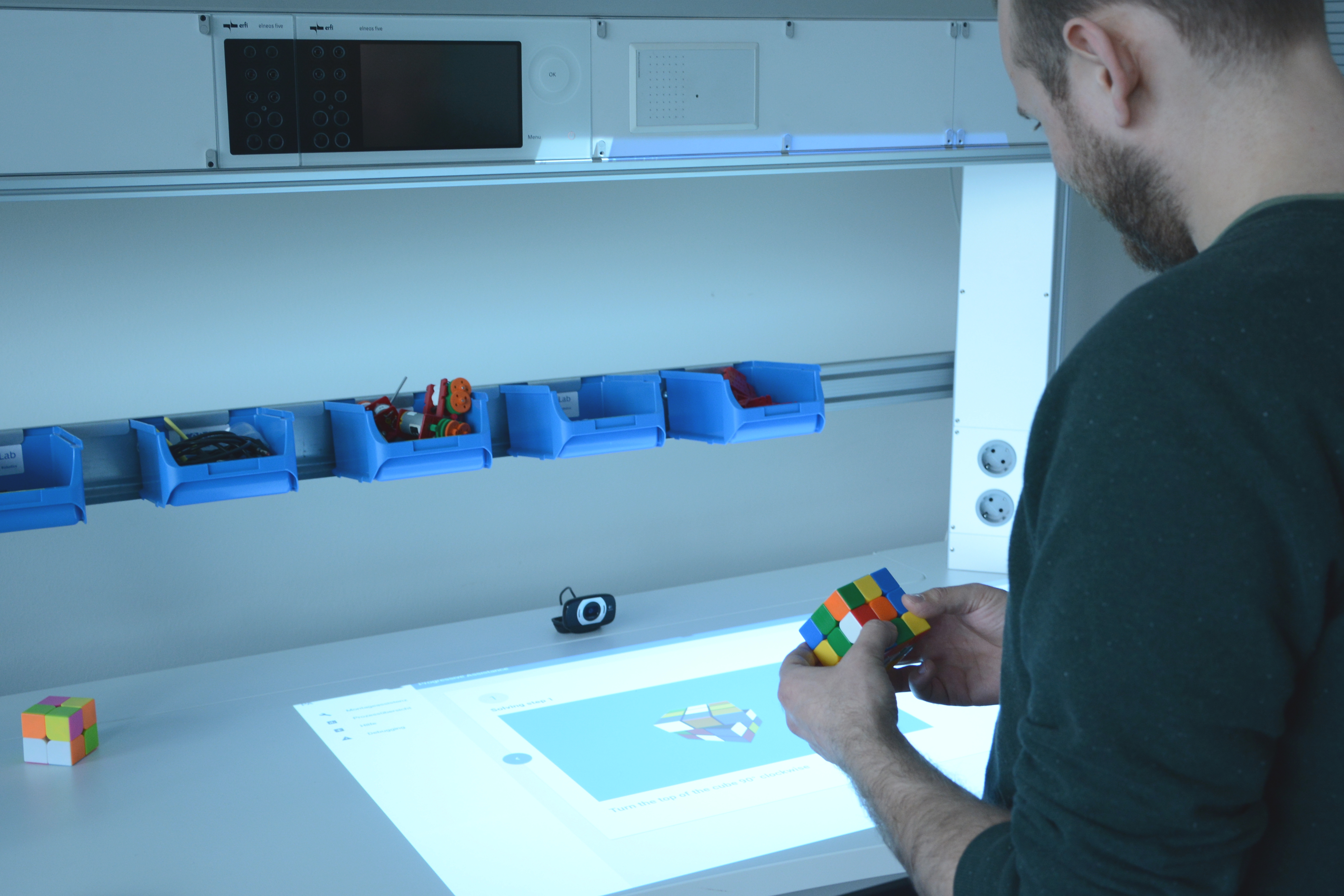 A solution in a few easy steps: A smart workbench shows how to solve a Rubik’s cube. Photo: CITEC/Bielefeld University