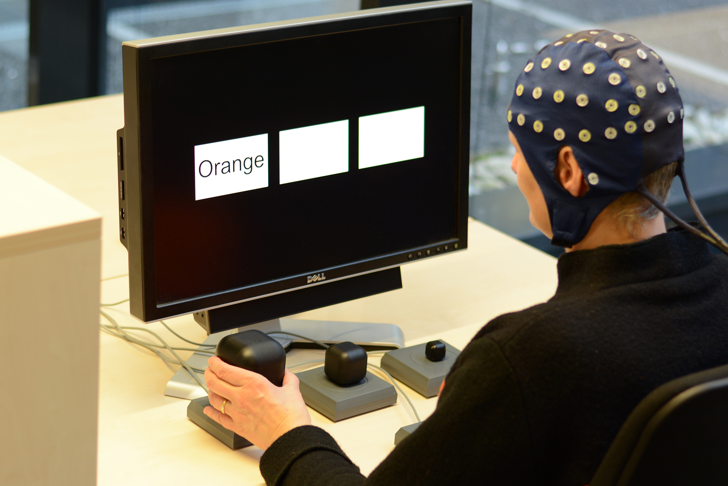 The participants sat in front of a computer screen, where three cubes were lying next to each other on the tabletop: one about the size of an apple, one the size of a table tennis ball, and one the size of a dice. On the screen behind the cubes, three white fields were displayed. Words then appeared in one of the fields on the screen – sometimes made-up words, sometimes real ones. When a pseudo-word such as “whask” was displayed, the participants did not have to do anything. But if a real noun like “orange” appeared, they were supposed to grip the cube corresponding to that respective field. An EEG electrode cap recorded brain activity, allowing the researchers to then evaluate how the word was processed.
