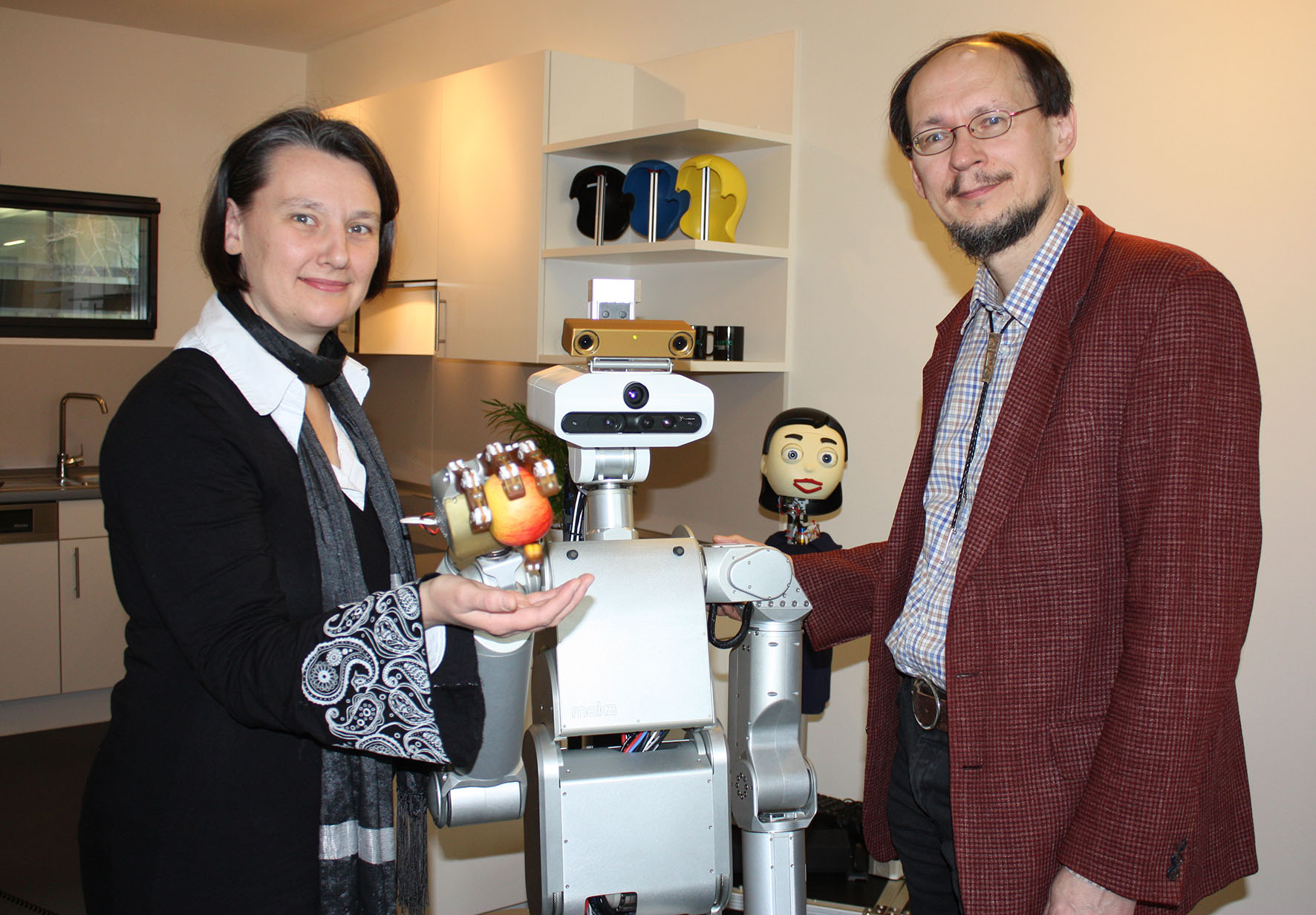 The service robot to be deployed in the apartment has the model name ‘Meka Mobile Manipulator M1’. It will be connected to the apartment’s sensors and control system so that the apartment can immediately direct it to where support is needed. Its torso is mounted onto a moveable base. Its hands are based on human hands, so that it can be taught to grip ‘naturally’. The robot should be able to spring into action to put shopping away in the fridge, for example, or to serve drinks to guests. At present the robot is wearing the sensor head it was delivered with. As part of the project, the robot will be equipped with a variant of the Flobi robot head, developed at CITEC. Flobi is a social robot with emotional facial expressions that can react to its counterpart. Research carried out at CITEC has shown that Flobi has greater acceptance by people as a conversational partner than systems with a more technical appearance.