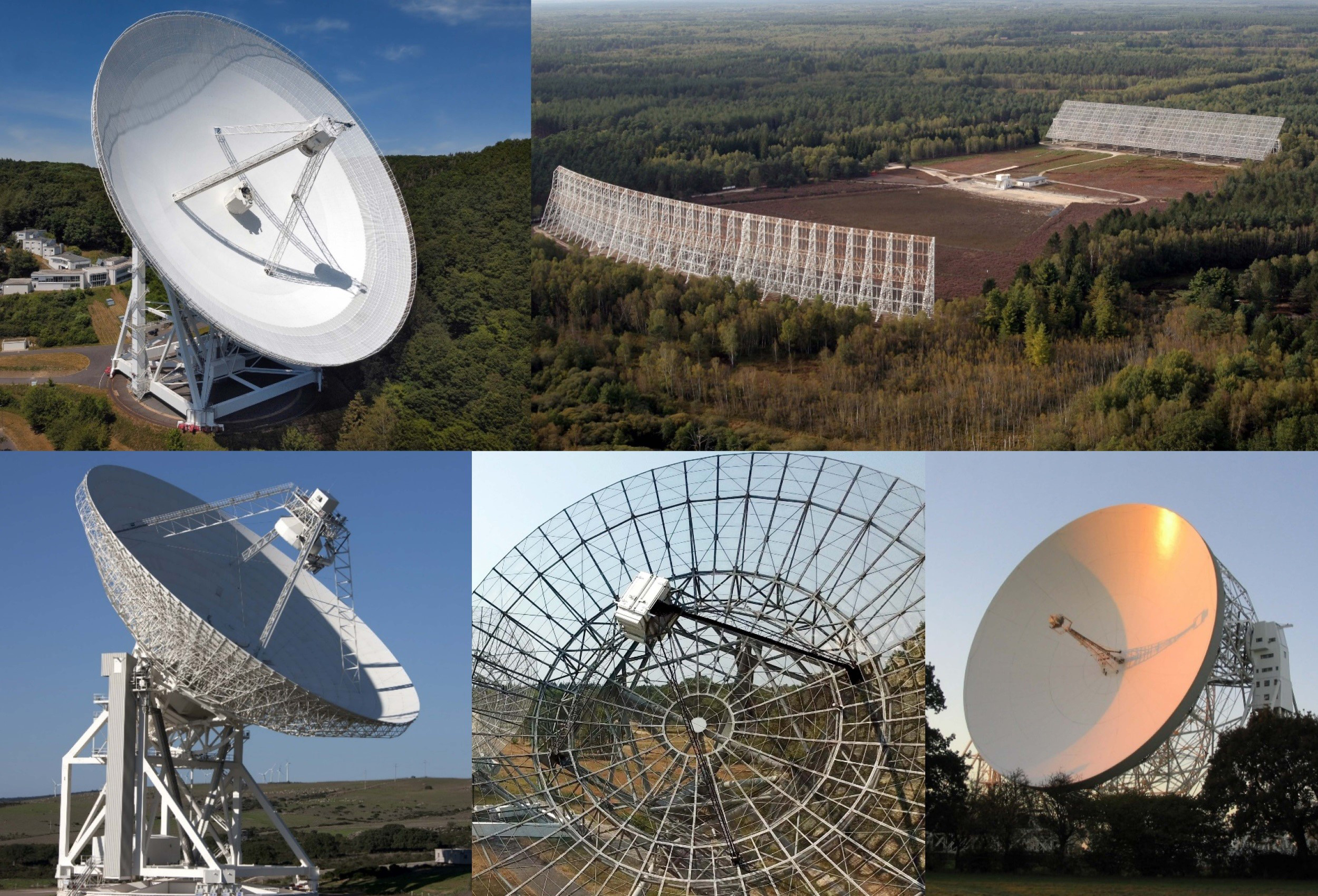 Radio telescopes of the EPTA network. Clockwise from upper left: Effelsberg 100-m Radio Telescope (Germany), Nançay Radio Telescope (France), Jodrell Bank Telescope (UK), Westerbork Synthesis Radio Telescope (WSRT, The Netherlands), Sardinia Radio Telescope (SRT, Italy).Credit: Norbert Tacken/MPIfR (Effelsberg), Letourneur and Nançay Observatory (Nançay), Anthony Holloway (Jodrell Bank), ASTRON (WSRT), Gianni Alvito/INAF (SRT).