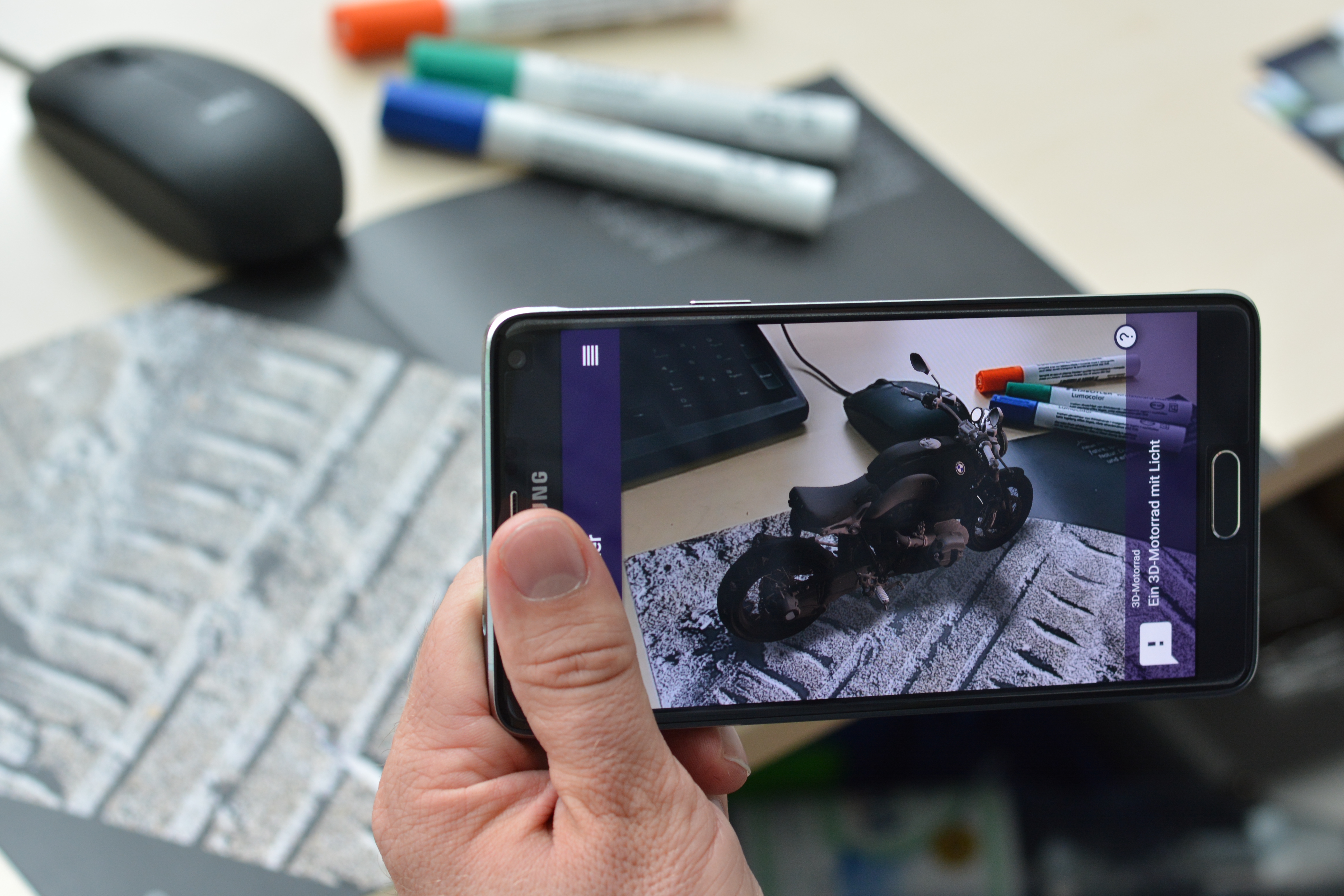 With special apps – pictured here from the Bielefeld company Raumtänzer – extra information from print media can be represented as augmented reality on a smartphone. Here, it appears as if a motorcycle were parked on top of the desk. Photo: CITEC/Universität Bielefeld