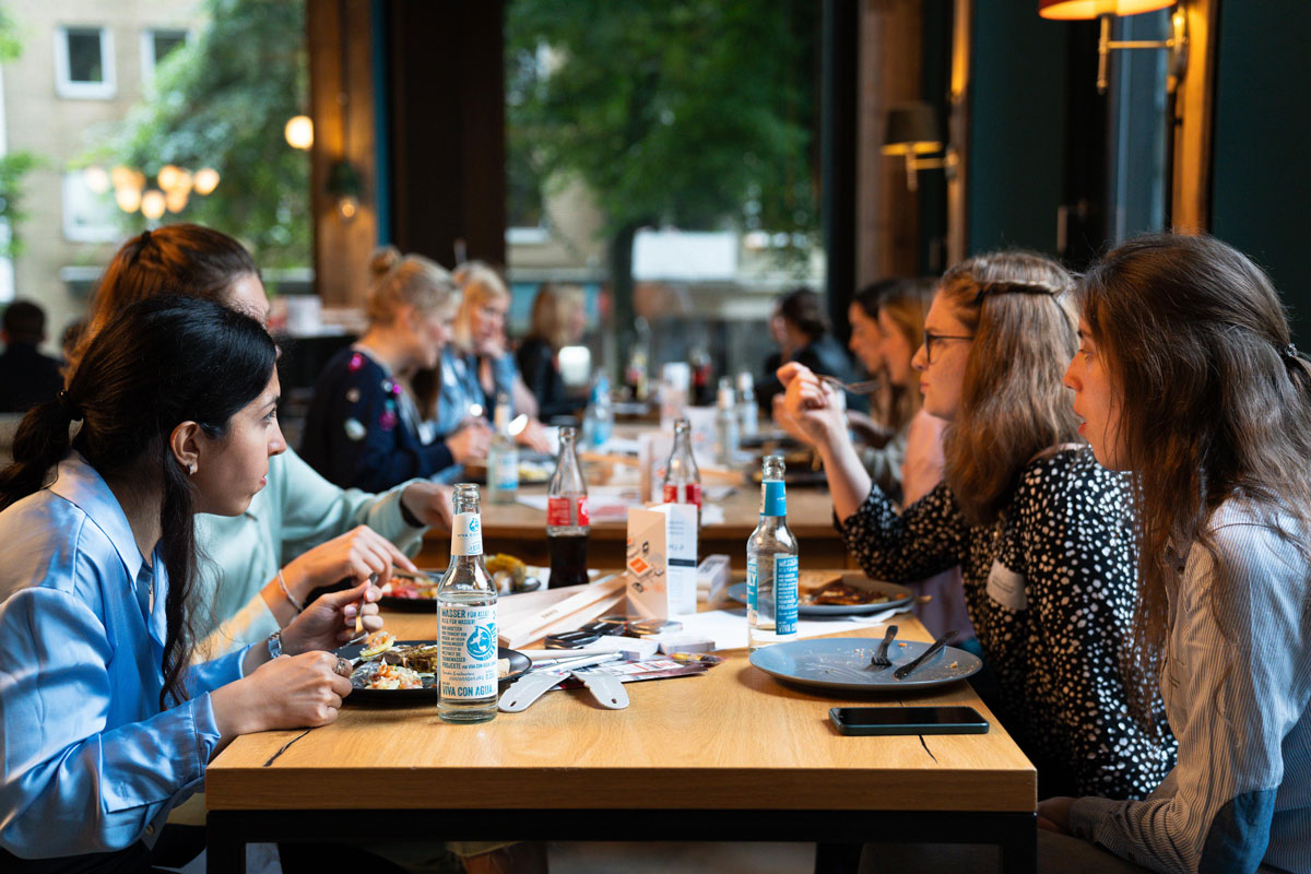 Anschließend folgte der Hauptpunkt des Abends: Das köstliche Buffet, zubereitet von SCHIMMACKS, zu genießen, sich mit den Anwesenden auszutauschen und wertvolle Kontakte zu knüpfen. Viele kennen sich bereits aus vergangenen Veranstaltungen und in entspannter Atmosphäre ergab sich die Möglichkeit über Praktika, Werkstudierendenstellen oder Option zum Berufseinstieg zu sprechen. Diese Chance wurde intensiv von den Studierenden wie Unternehmensvertreter*innen genutzt.