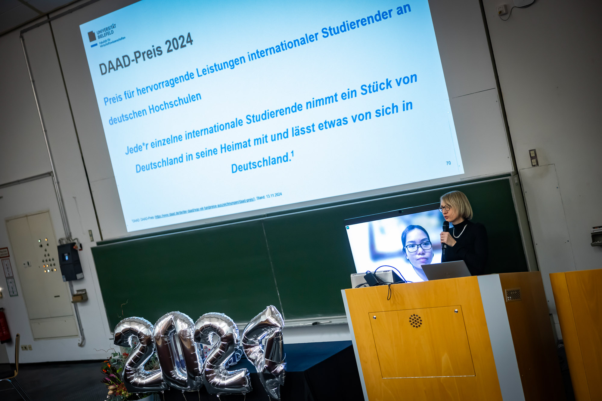 Ein weiterer Höhepunkt war die Verleihung des renommierten DAAD-Preises 2024, der an Thanh Tao Bui aus Vietnam ging. Bui, die sich derzeit in ihrem Masterstudium befindet, überzeugte nicht nur durch akademische Exzellenz, sondern auch durch ihr zusätzliches Engagement für internationale Studierende. In einem Vorwort würdigte Professorin Dr. Michaela Vogt, Rektoratsbeauftragte für internationale Vernetzung die Bedeutung von internationaler Zusammenarbeit in Studium und Forschung. Anschließend betonte Professor Dr. Dominik Karos in seiner Laudatio Thanh Tao Buis wertvollen Beitrag zu einem internationalen Austausch.