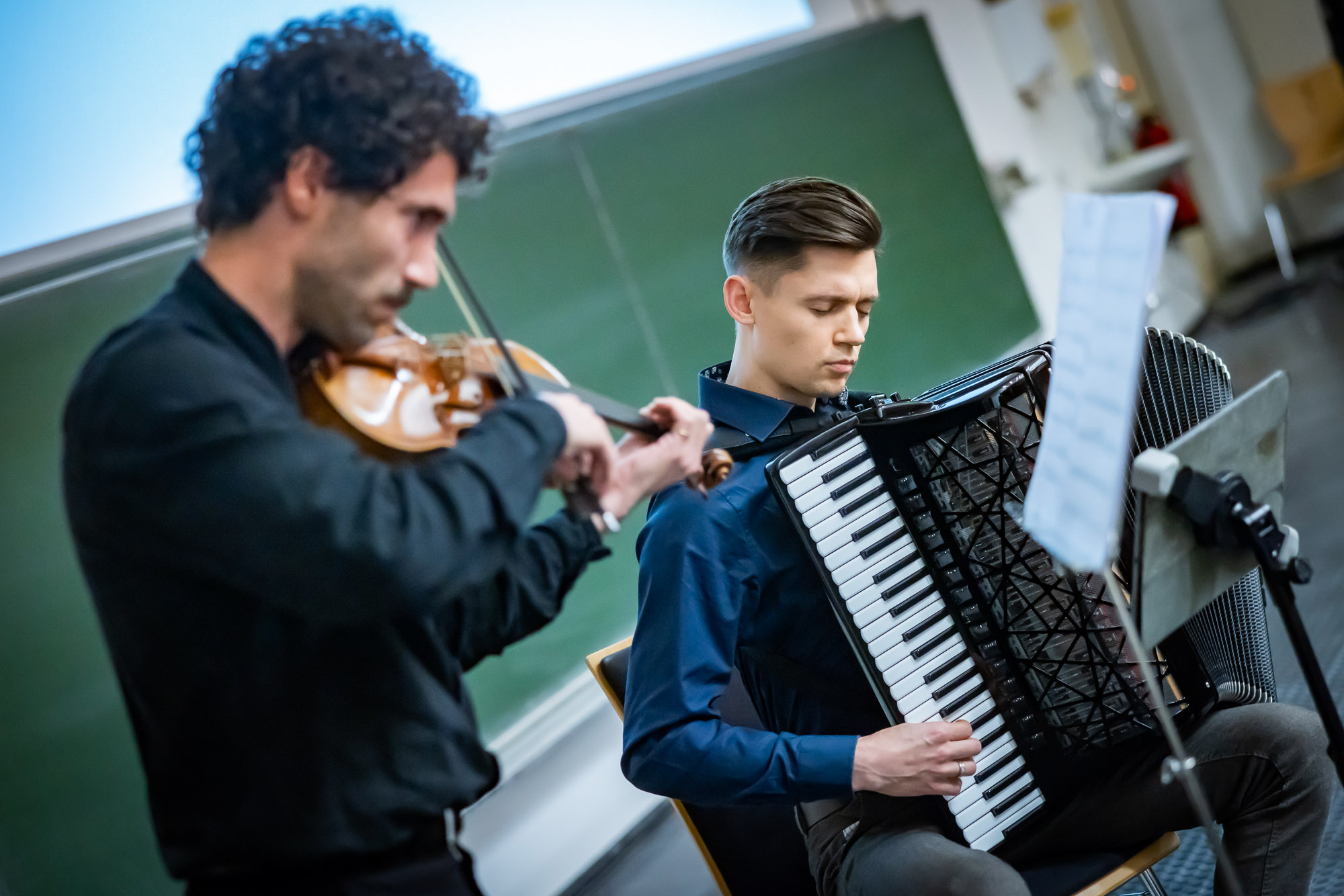 Der Abend begann schwungvoll: Zum berühmten „The Final Countdown“ von Europe zogen die Absolvent*innen in den Hörsaal ein, begleitet von Pavel Efremov am Akkordeon und Mario Siegle an der Geige. Dekan und Studiendekan begrüßten die Gäste herzlich und leiteten die Feierlichkeiten ein. Ein besonders persönlicher Moment war die Ehrung aller Absolvent*innen: Jeder Einzelne wurde nach vorn gerufen und der Titel der jeweiligen Abschlussarbeit wurde auf einer Leinwand eingeblendet – ein eindrucksvoller Einblick in die Vielfalt der wissenschaftlichen Arbeiten der Fakultät. Musikalisch untermalt wurde dieser Teil mit Astor Piazzollas „Libertango“.