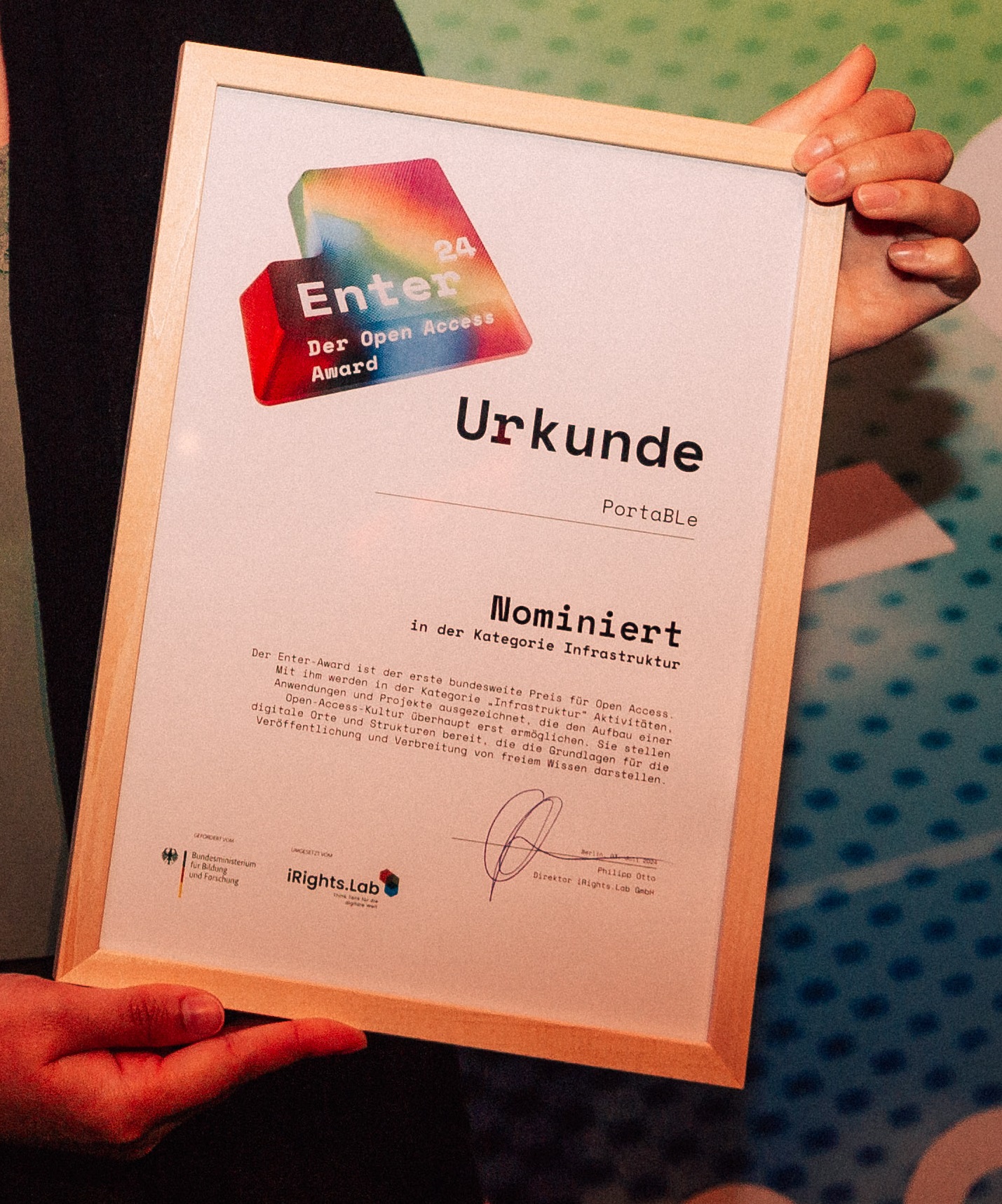 Der Shortlist-Platz von PortaBLe wurde mit einer Urkunde gewürdigt, die Dr. Julia Schweitzer auf der Award-Bühne in Empfang nahm. Die Nominierung für den Enter-Award ist eine tolle Anerkennung für die intensive Entwicklungsarbeit, die in PortaBLe investiert wurde. Und sie verweist auf die Wertschätzung der Lehrkräftebildung im Rahmen eines allgemeinen Open-Access-Preises.